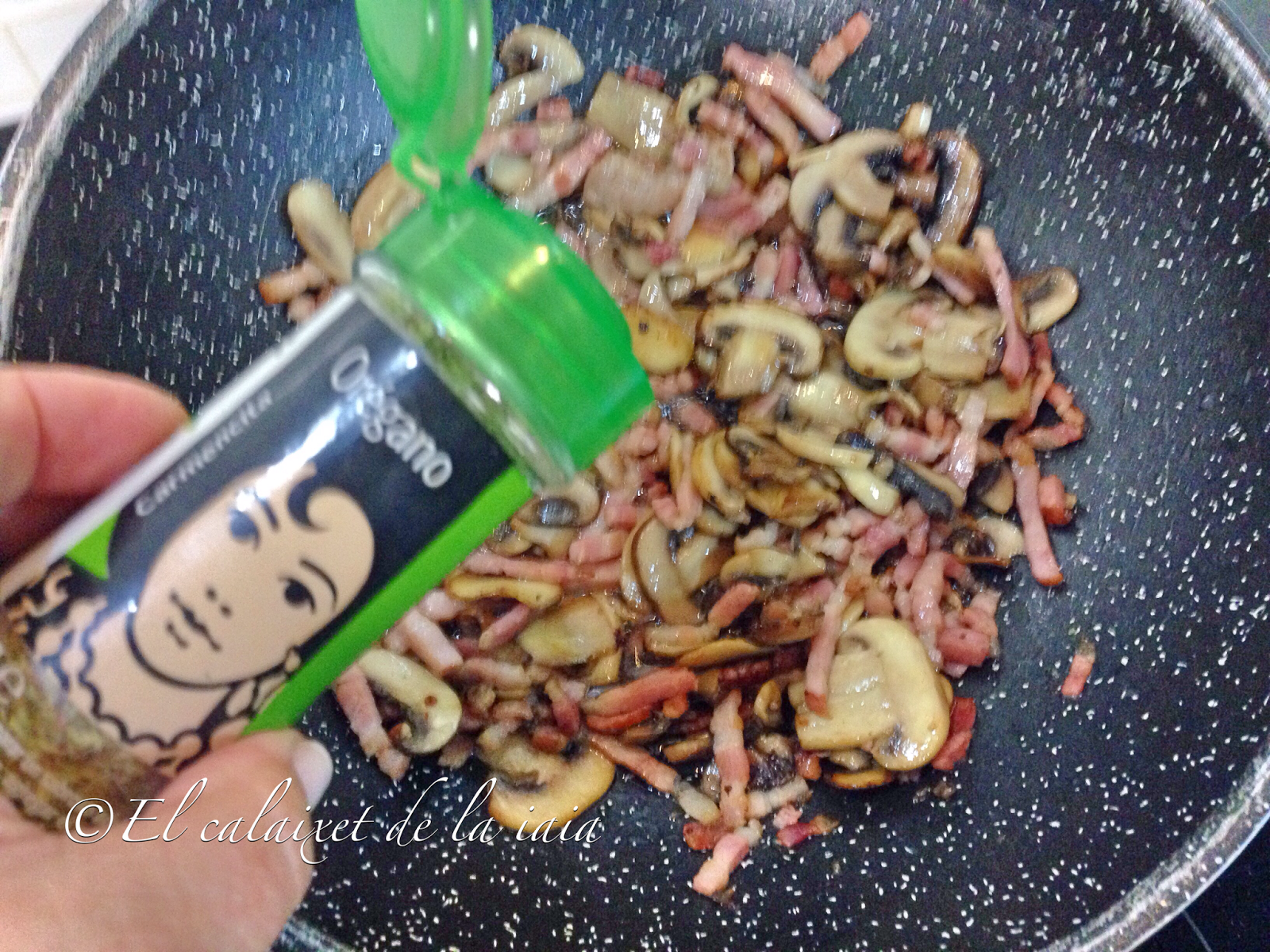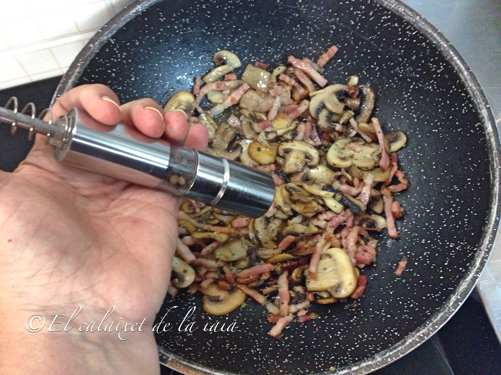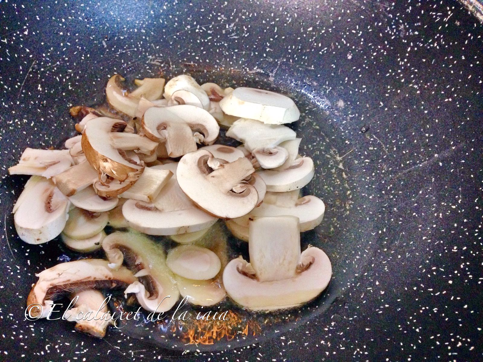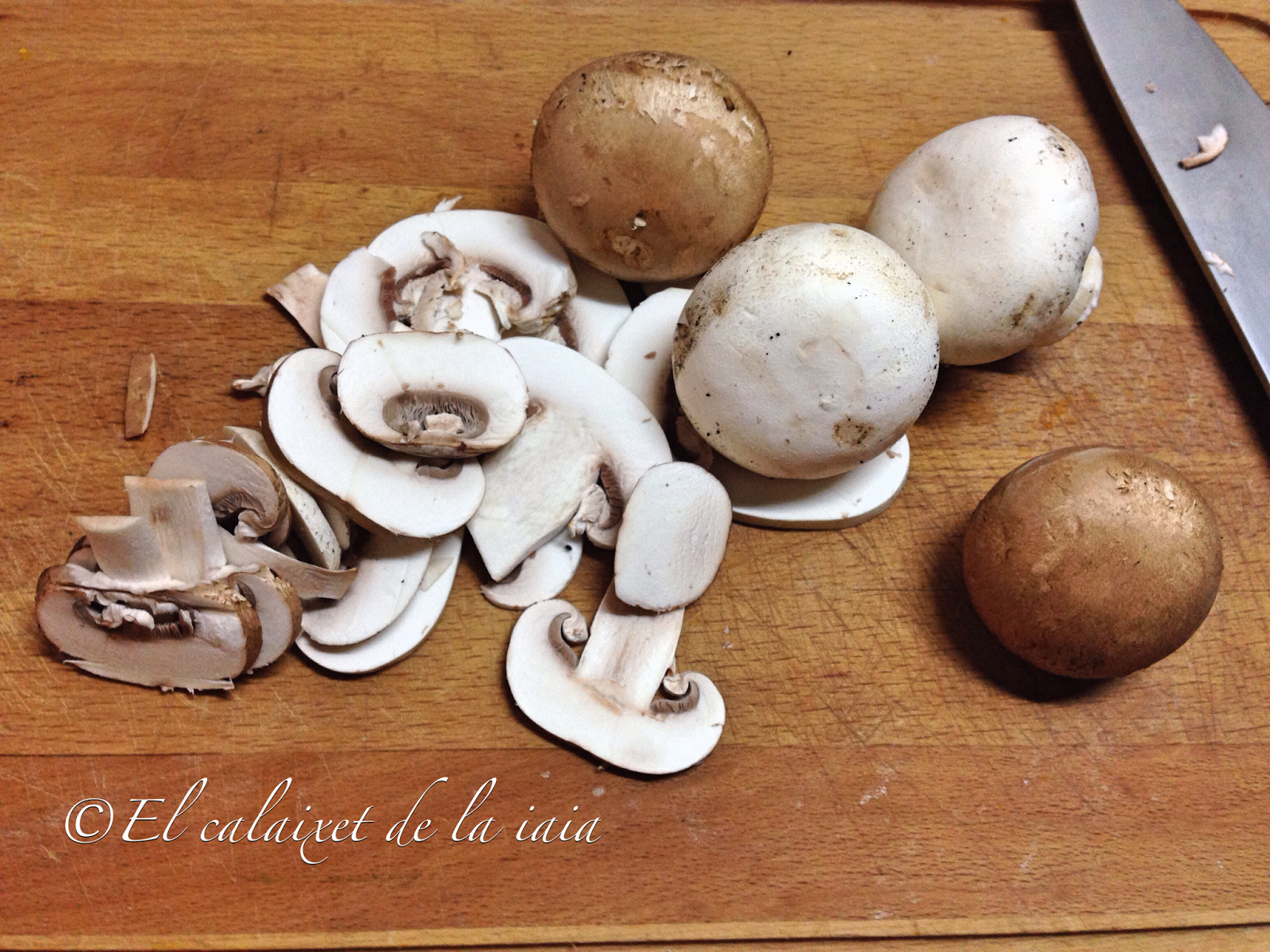 Mientras tanto limpiaremos de tierra los champiñones y los laminaremos. Hoy he comprado champiñones de dos variedades, (Agaricus bisporus) también llamado «champiñón de París» y (Agaricus brunnescens) conocido como «champiñón exótico» que hay quien lo considera la versión gourmet del champiñón de París por tener una textura más carnosa y un sabor más intenso, aunque presenta una menor calidad nutricional. Tanto uno como otro son muy ricos en vitaminas y minerales, ejercen un eficaz efecto saciante, son ideales para dietas bajas en caloría y dicen que con grandes propiedades cardiosaludables, cuyo consumo reduce la acción del cáncer de mama, el cáncer de colon y la leucemia, así que ya sabéis ¡a consumir champiñones!