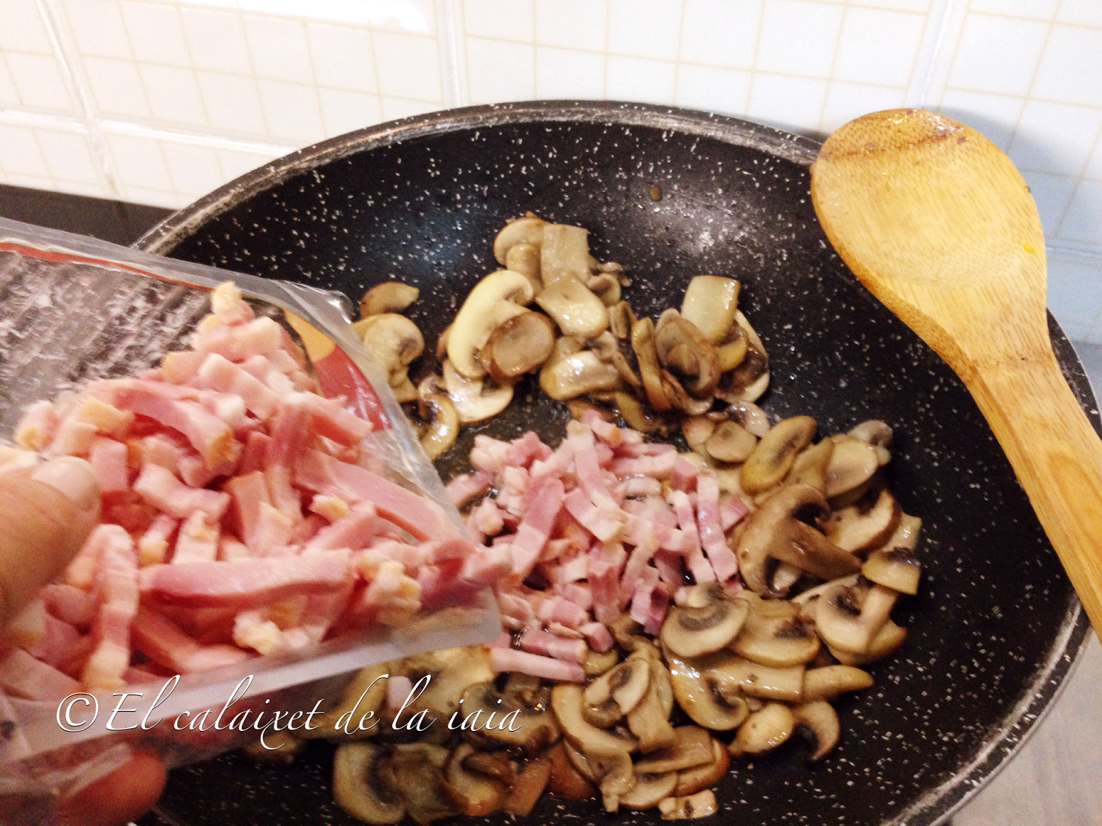 enseguida añadiremos el beicon que ya soltará su propia grasa, dejaremos fuego lento que se vaya tostando y soltando su jugo