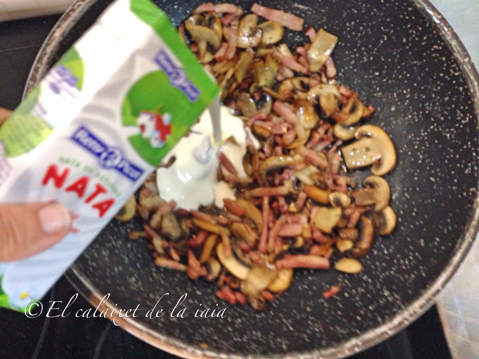 y agregamos la nata, que si no os gusta o preferís, la podemos sustituir por leche vaporada para rebajar calorías. Removemos y dejamos que se integre a fuego mínimo