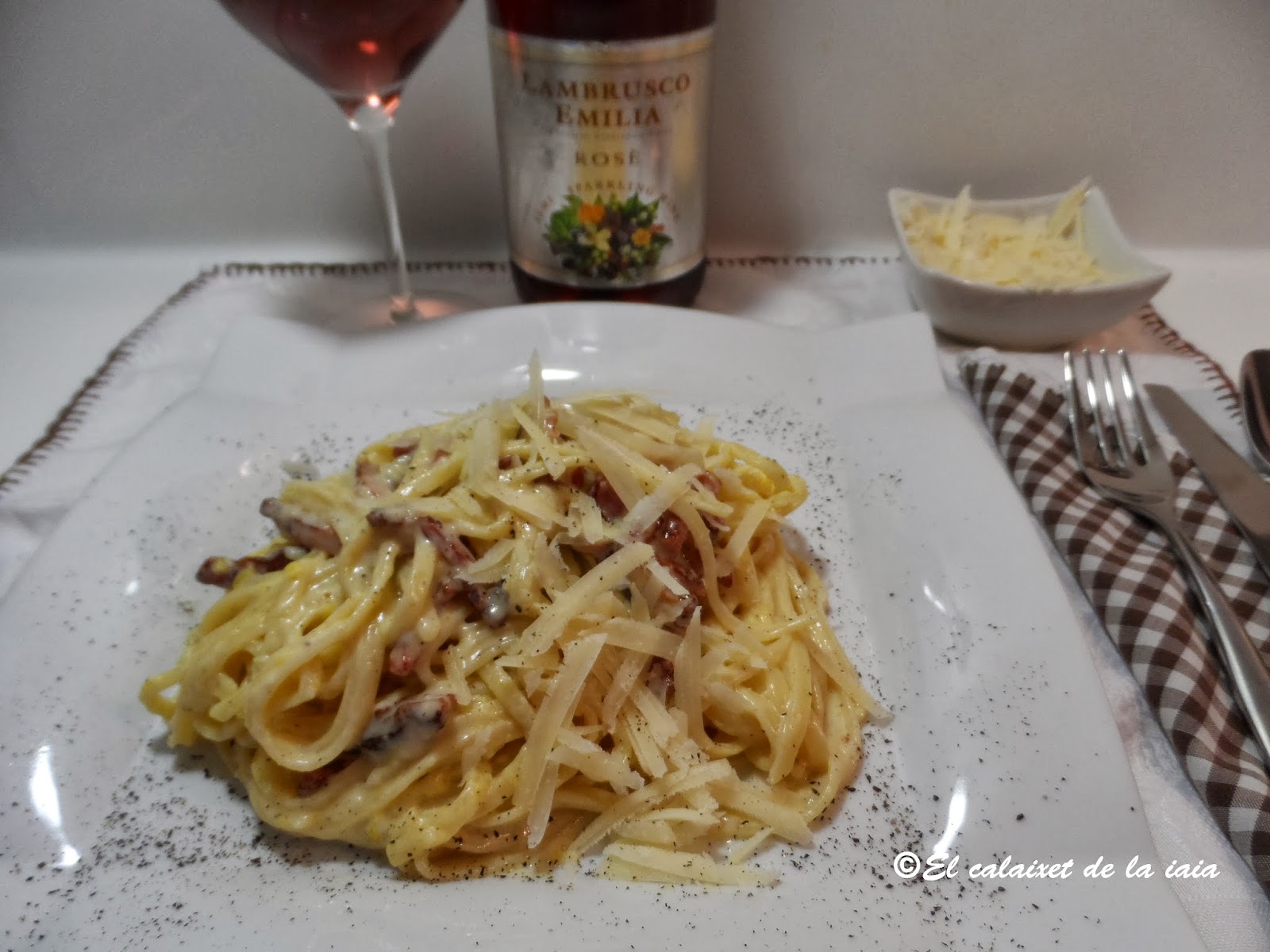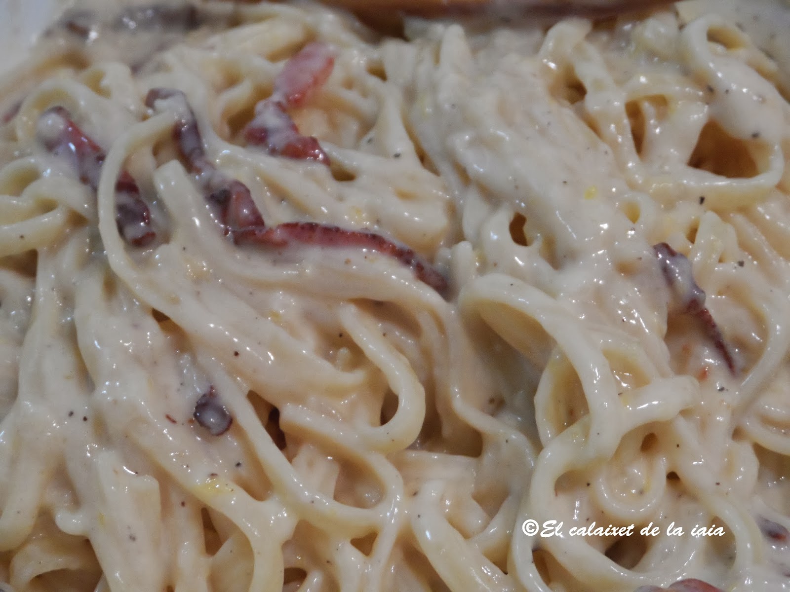Tallarines con beicon, nata y huevo.