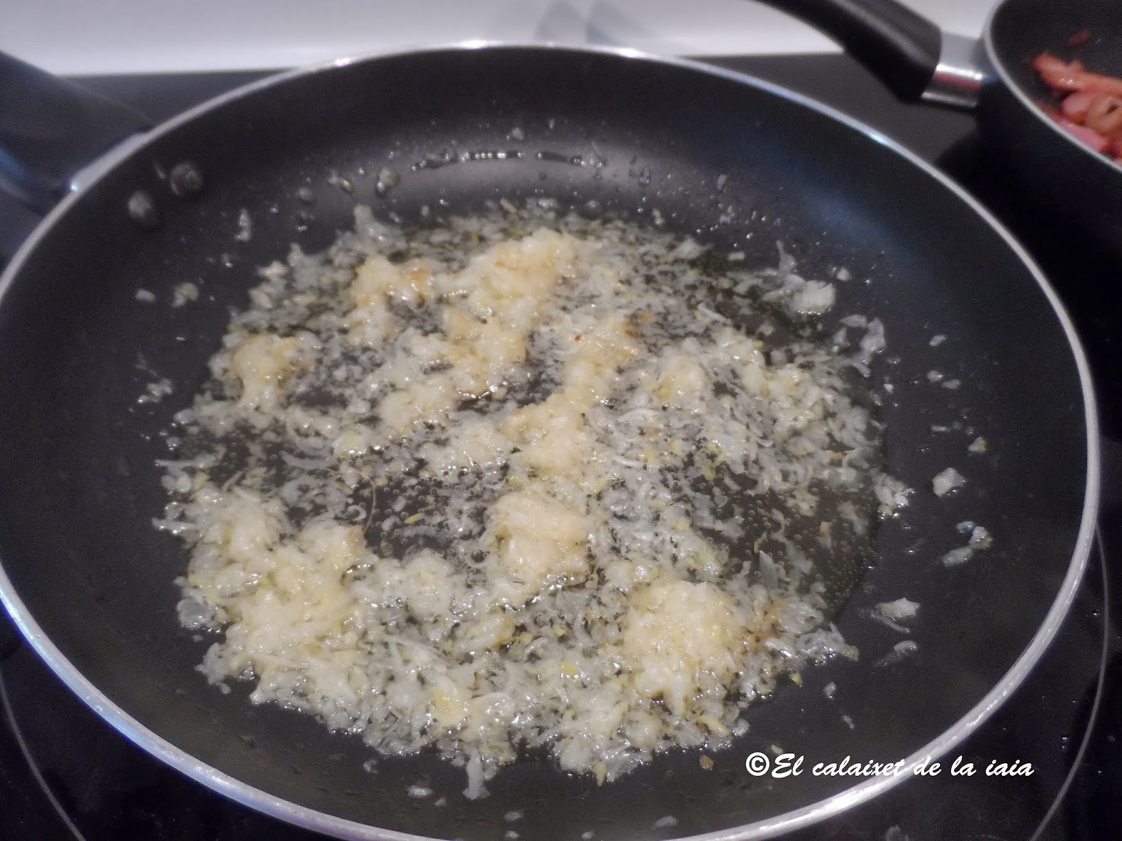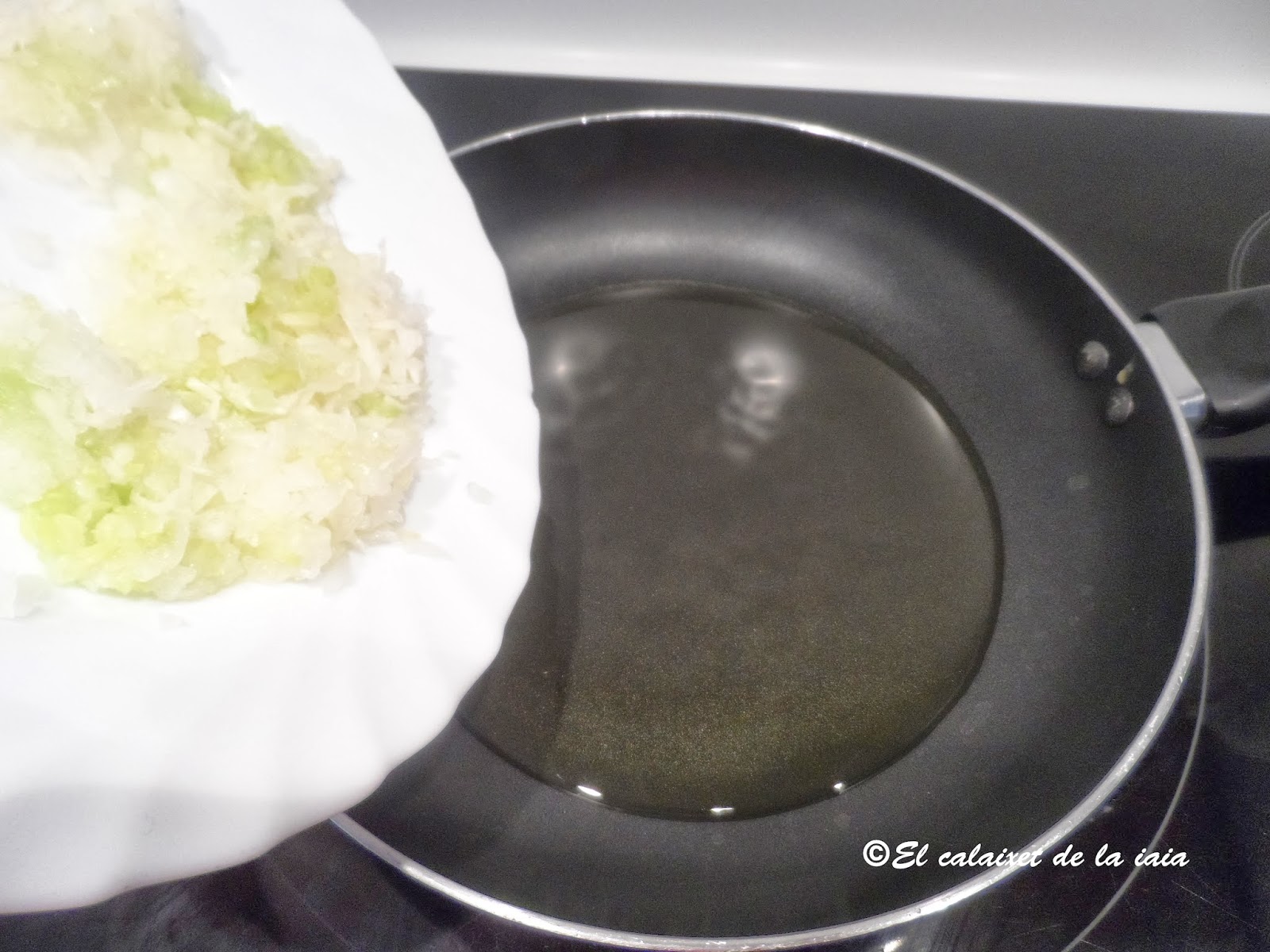 En vista de que lo que mas tarda en hacerse en la cebolla porque la hemos de pochar lentamente, empezaremos pelándola, rallándola y poniéndola al fuego con unas cucharadas de aceite de oliva,