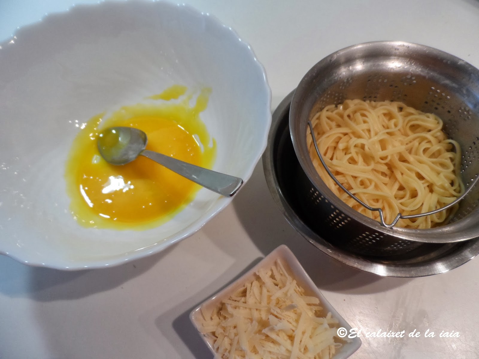 y añadimos de inmediato al bol, removemos bien para que el calor de los tallarines cuajen el huevo,