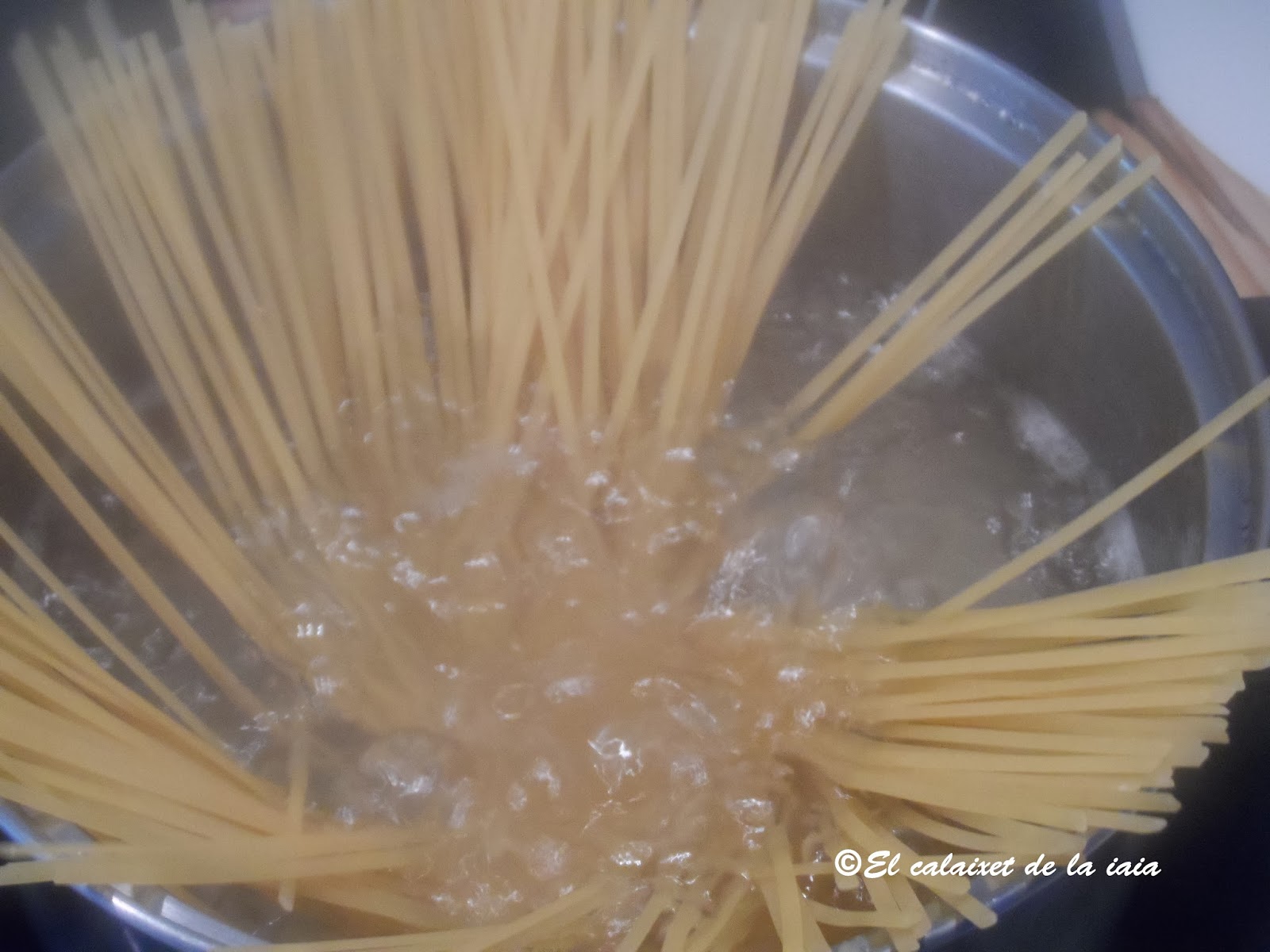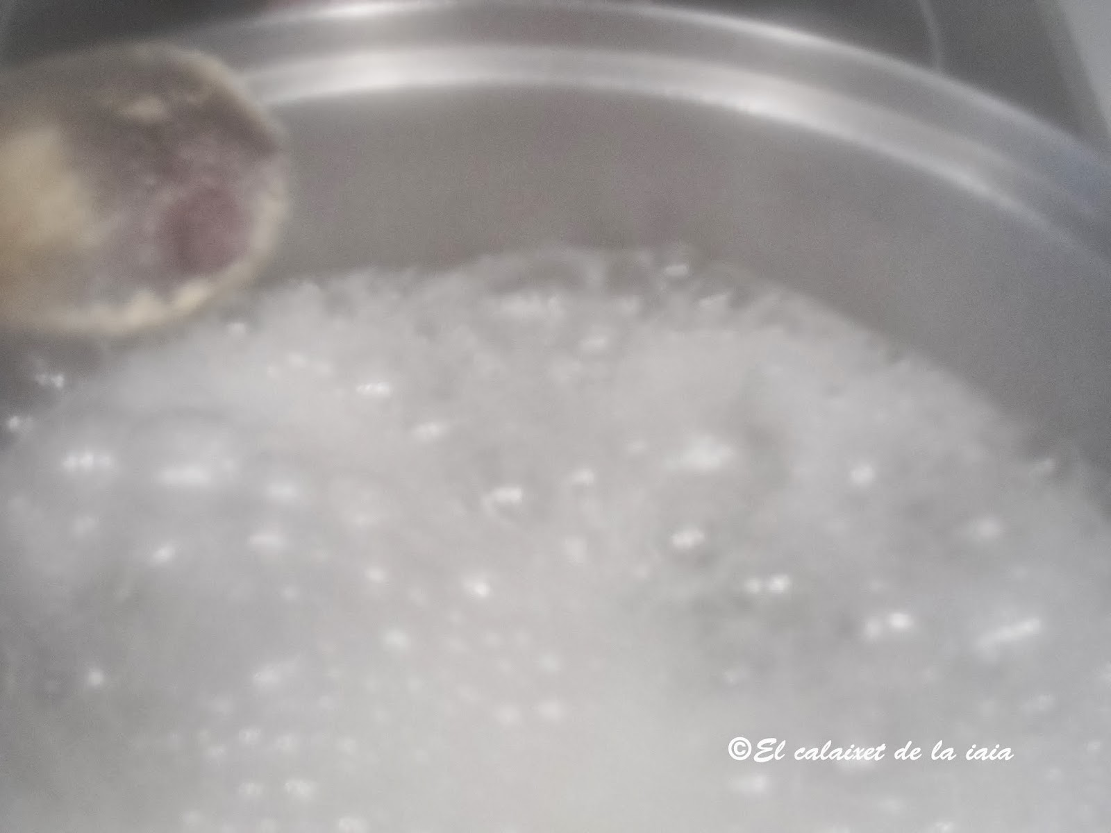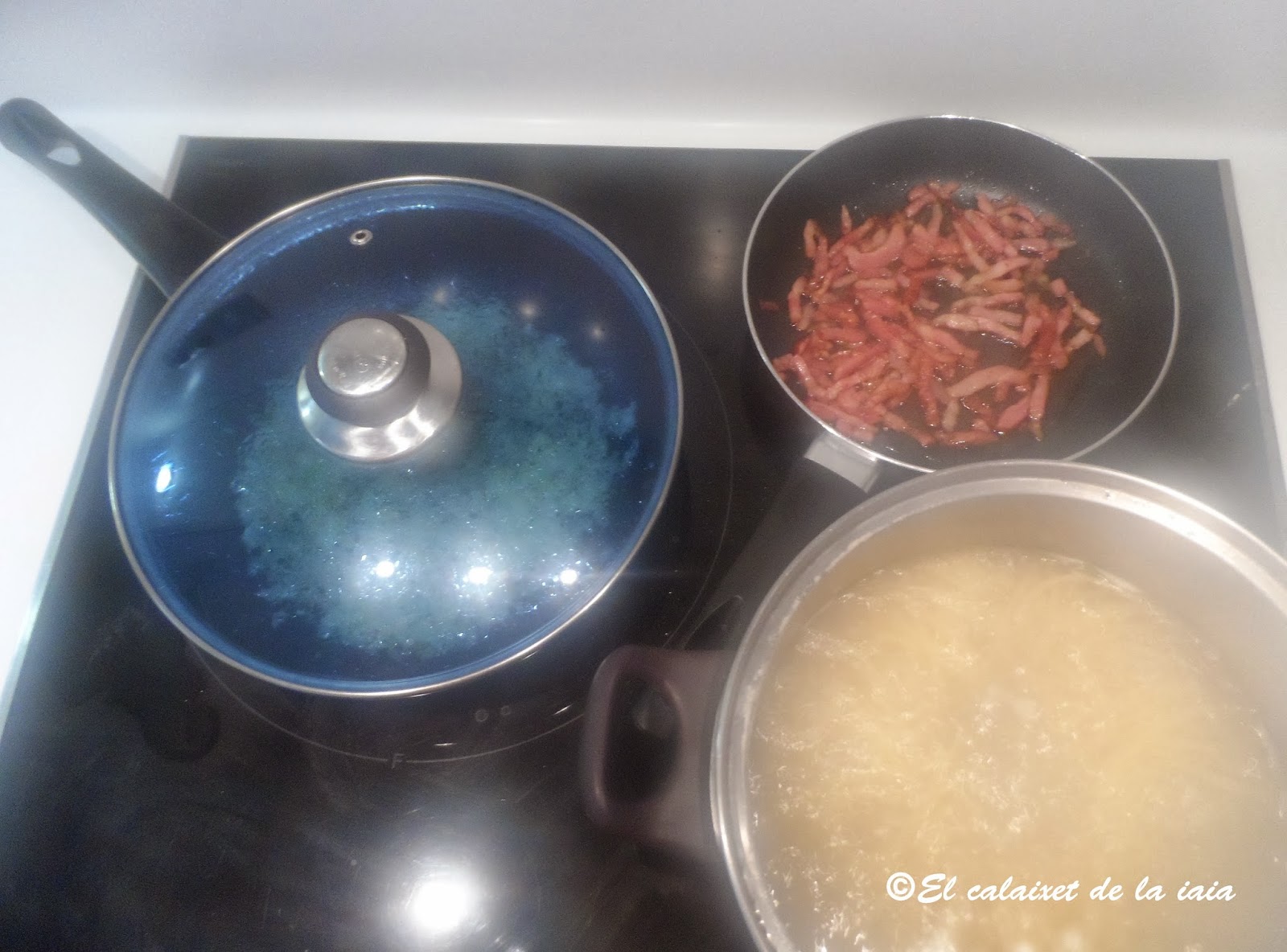 Pondremos a hervir en un recipiente amplio, dos litros de agua,cuando empiece a hervir, pondremos sal o una pastilla de caldo Avecrém (esto a vuestro gusto, en casa, desde siempre para hervir la pasta y las verduras, se ha puesto Avecrém en lugar de sal y un famosísimo endocrino, que llevaba a mi madre, me aseguró que era un acierto) y la grasa que ha soltado el beicon.