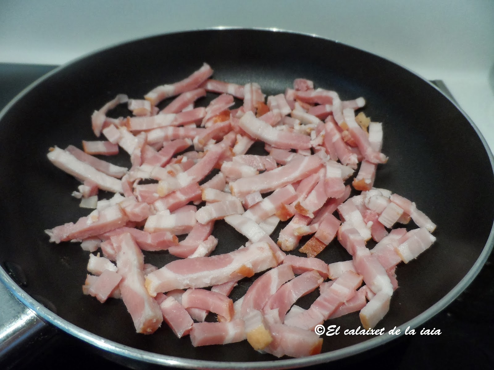 En otra sartén ponemos a freír los dados de beicon hasta que estén dorados a nuestro gusto, en mi caso muy cujientes. No pondremos aceite, ya que el beicon irá soltando su propia grasa.