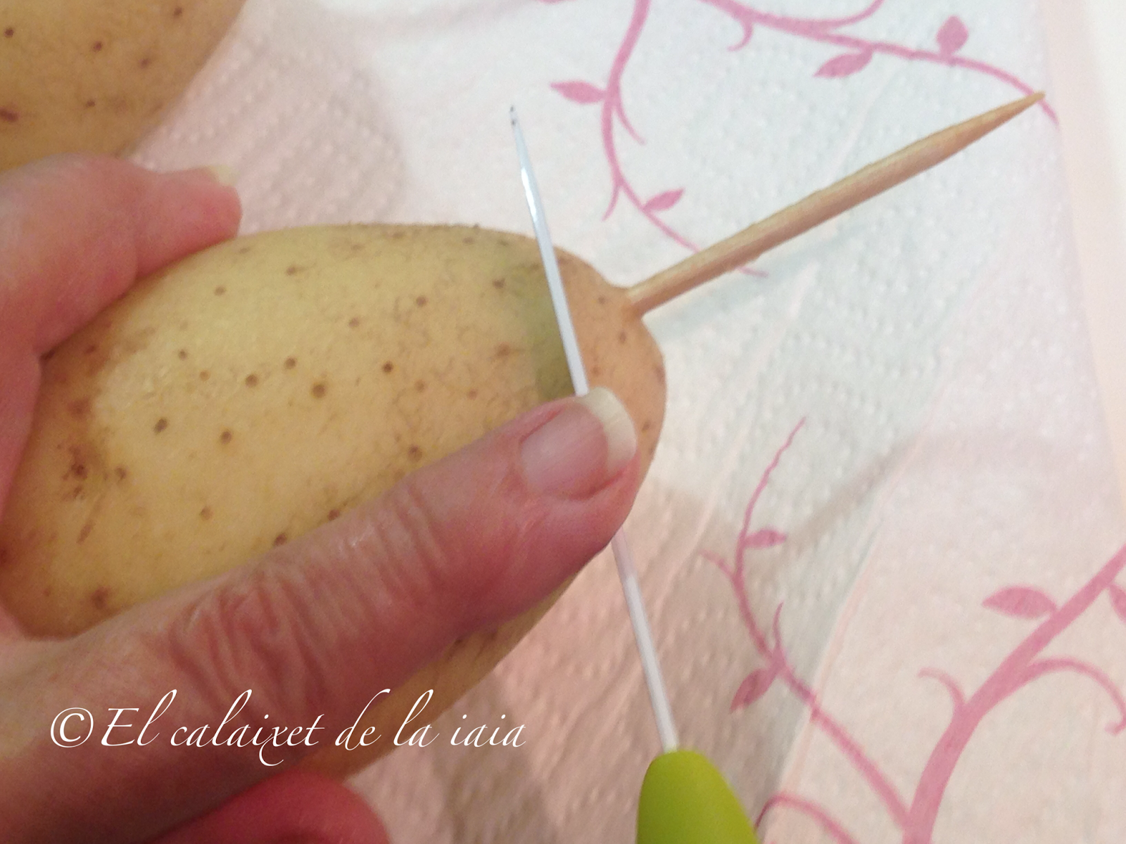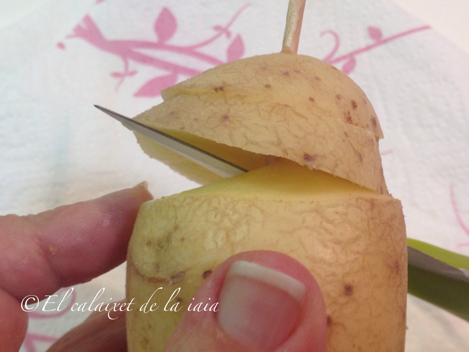sin despegar el filo del palillo con el fin de cortar la patata circularmente hasta la parte de abajo