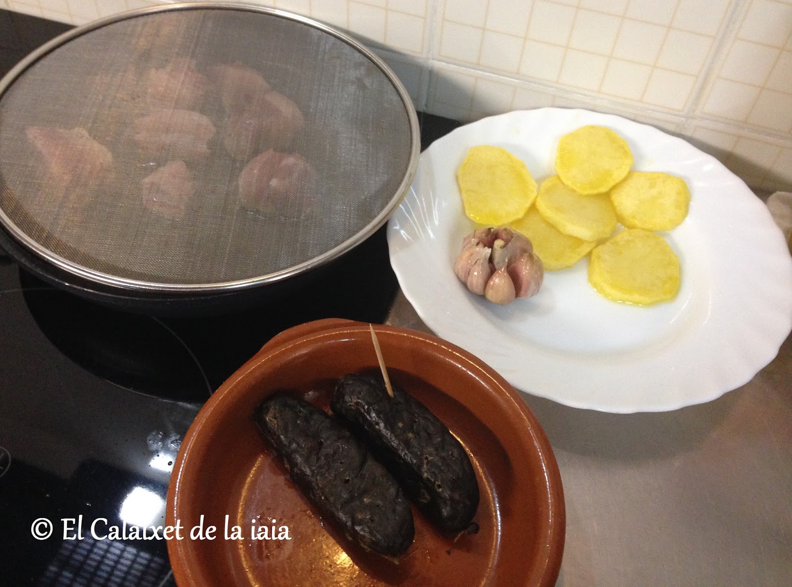 en el mismo aceite, freiremos la panceta troceada y las costillitas. Pincharemos con un palillo las morcillas para evitar que se deshagan a pesar de estar oreadas