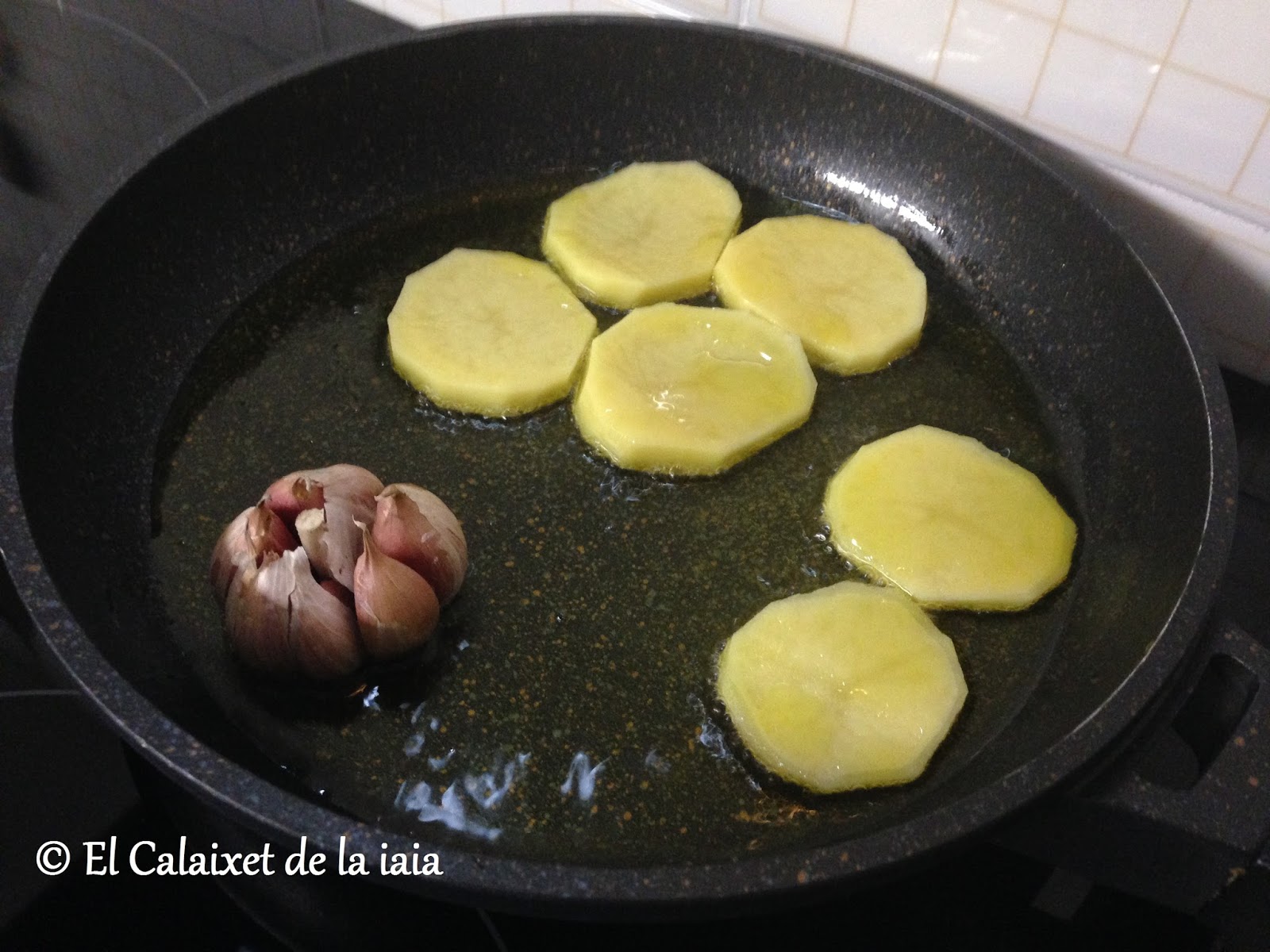 En un principio pensé poner trozos de calabaza en lugar de la patata, pero es que a mi me encanta la patata mezclada con el arroz un chorrito de limón mmmmm, y por otra parte igual añadiendo rodajas de calabaza, sabría demasiado, así que, pelaremos una patata y la cortaremos en rodajas como de un cm mas o menos y las pondremos a dorar en aceite de oliva junto a la cabeza de ajos. Cuando esté dorada reservamos