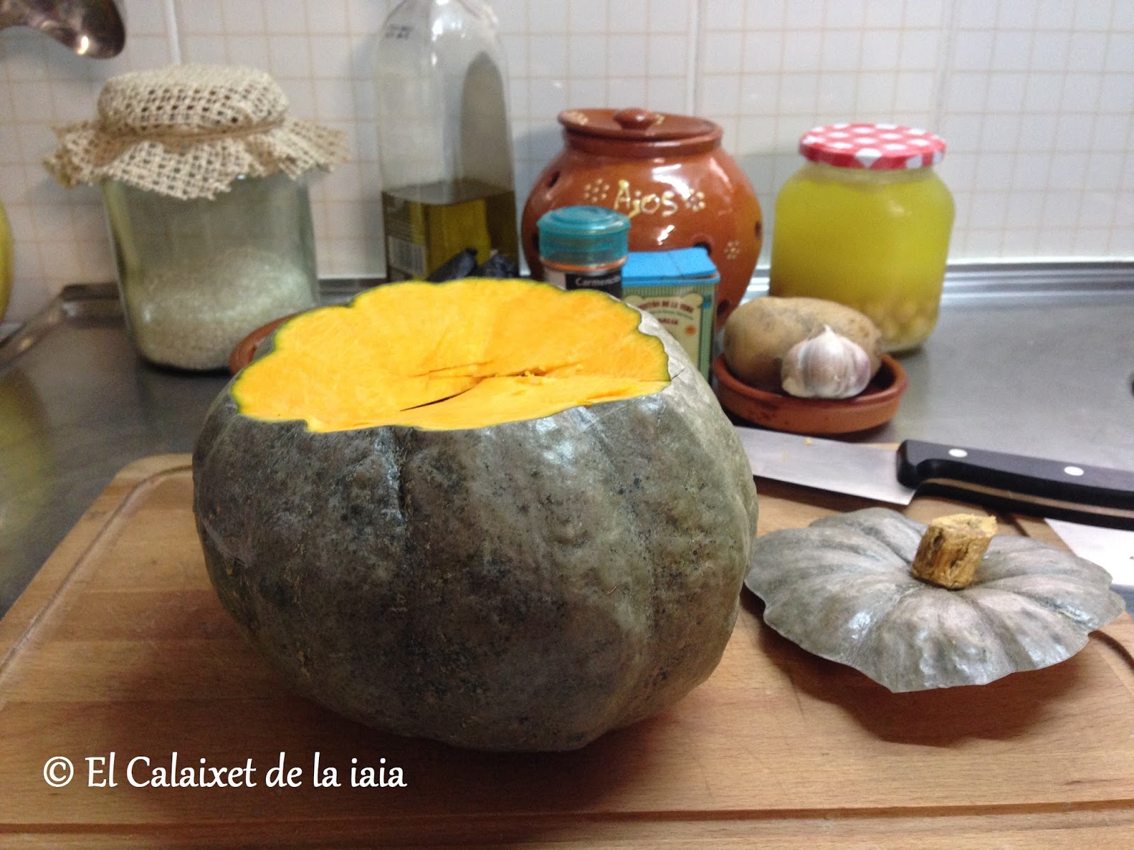 Mirad bien, que este tamaño de calabaza es solo para tres, si sois mas la calabaza, ha de ser proporcionalmente mas grande, de lo contrario no os cabrán dentro los ingredientes necesarios, ya veis que justita me queda a mi, aunque en principio era para dos, comimos tres perfectamente.