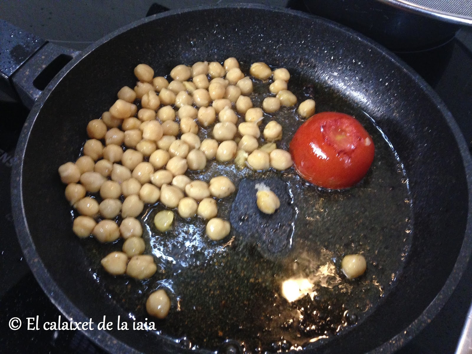 añadimos los garbanzos que tengo cocidos y que guardé junto al caldo de un cocido. Mientras tanto pondremos el horno a calentar a 180º, colocaremos la calabaza en una bandeja o cazuela y la introduciremos en el horno durante 15 minutos