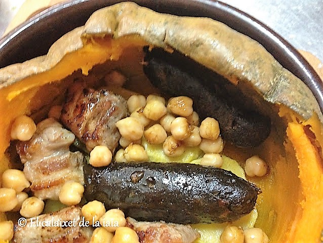 una vez transcurridos y con la calabaza bien caliente (calor que ayudará a mantener la cazuela de barro) introduciremos las patatas, las costillas, morcilla. Subiremos el horno a 190º y meteremos en el horno la pulpa de la calabaza en una cazuelita, y las pipas en otra para aprovechando el calor, que se vayan horneando mientras acabamos de preparar la calabaza para cocer el arroz