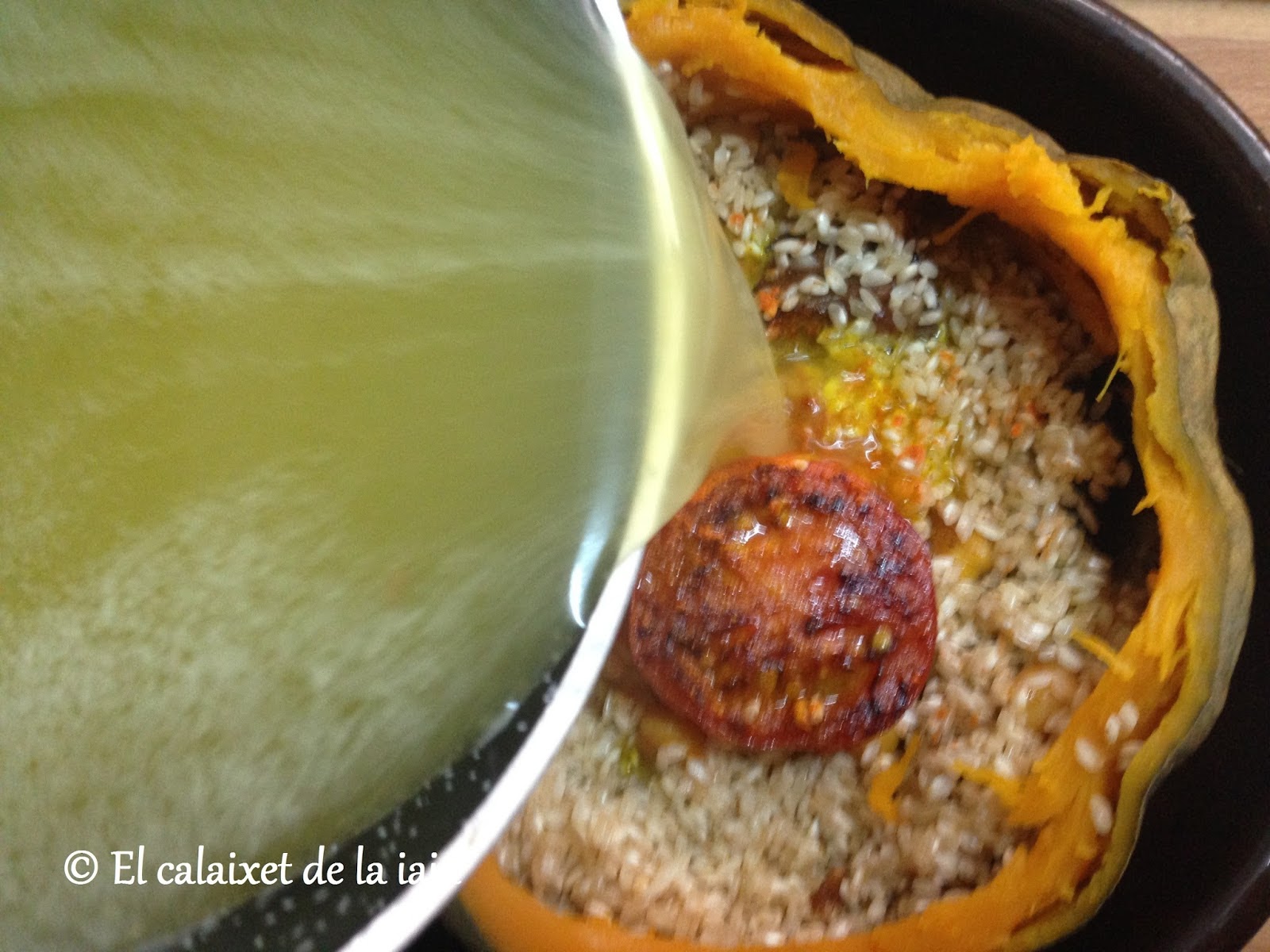 y el caldo hirviendo, tened en cuenta que es muy importante que esté hirviendo, así al estar la calabaza caliente y el horno a 190º, el caldo comenzará a hervir enseguida para cocinarse el arroz debidamente. Rectificar de sal.