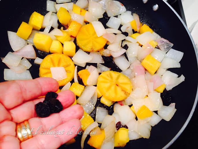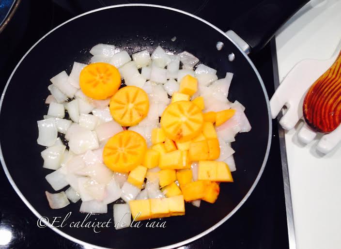 Troceamos en dados la otra media cebolla.Preparamos la guarnición de caqui, pelándolo y troceándolo en dados. Por si no conocéis el caqui, a mi parecer es una mezcla entre mango, melocotón y albaricoque que merece la pena comer ya que tan solo una pieza, aporta la ingesta adecuada diaria de calcio, hierro y magnesio, y altos niveles de potasio y cobre.