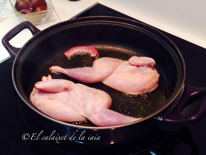 Ponemos el aceite a calentar y cuando esté en su punto de calor, salpimentamos la perdiz y la doramos por ambos lados