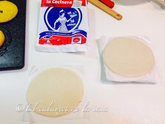 Lo normal es hacer dos pastelitos por comensal y necesitaremos una rodaja de caqui y dos obleas por cada pastelito