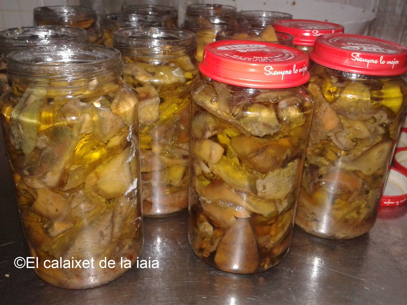 Cuando no damos a basto a comerlos y regalarlos y como venderlos va en contra de sus ideas, los suelo congelar en porciones individuales, pero a veces, el arcón está lleno y no caben mas, así que no queda otra que prepararlos en conserva, aunque como mas me gustan son congelados,los preparo igual que para conserva pero en bolsitas individuales y al congelador.