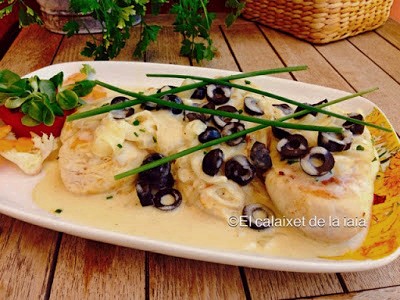 y emplatamos colocando las pechugas y sobre las mismas, la salsa, las aceitunas y cebollino picado