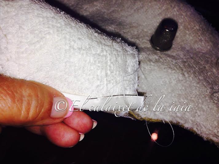 Ahora cosemos el bies, primero por el derecho de la pieza y luego por el revés de la misma. Podéis coserlo a máquina pero a mi me encanta coser a mano, aparte de que cuando me siento a hacerlo es por la noche, cuando todos descansan porque no dispongo de mucho tiempo durante el día y disfruto cosiendo en la soledad de la casa, plasmando lo que mi mente diseña. Cada cual se relaja a su manera….