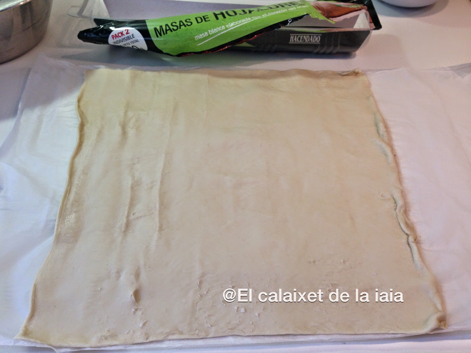 desenrollamos con cuidado la masa, si es rectangular, cortamos un trozo, podemos usarla redonda o cuadrada