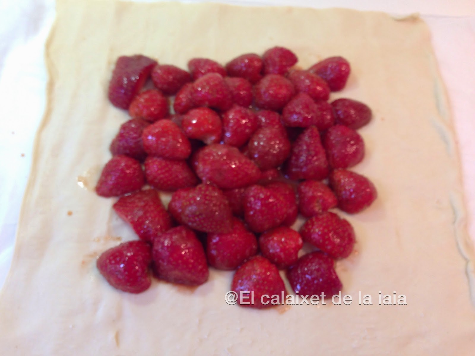 los escurrimos bien, les quitamos la corola, los partimos por la mitad, añadimos una cucharada de harina de maiz para evitar que el jugo que suelten los fresones en el horno empapen excesivamente la masa de hojaldre, ya que no ponemos crema alguna