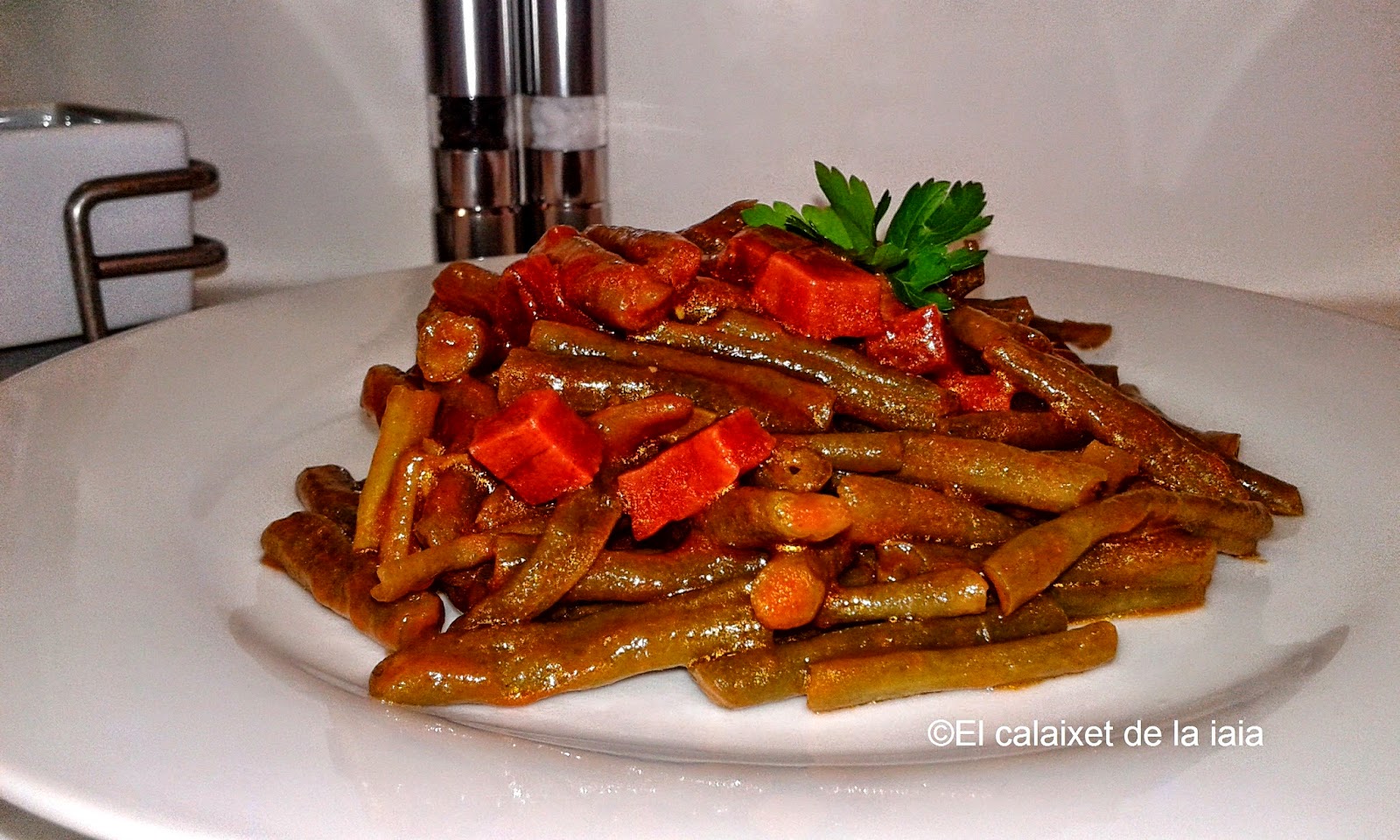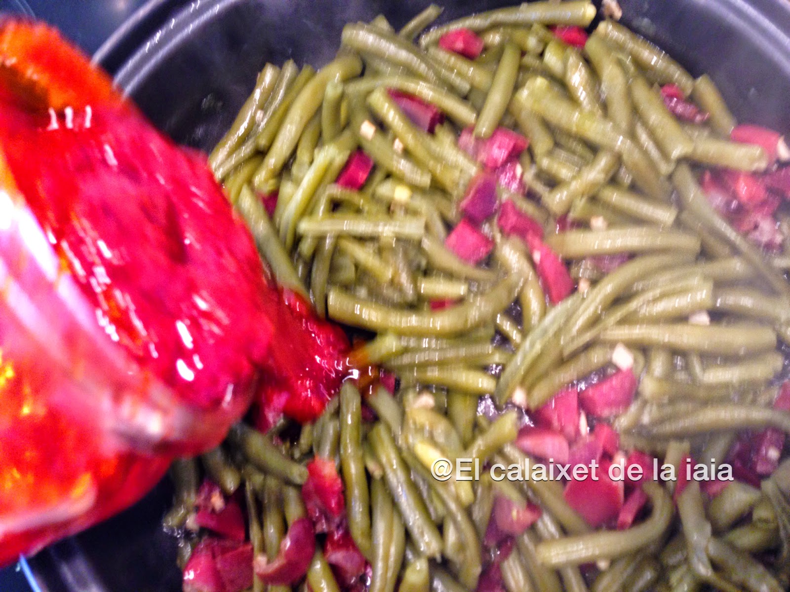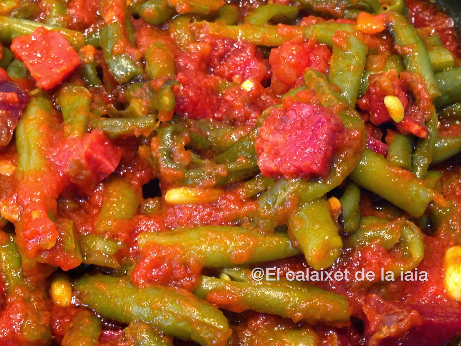 Si puedo elegir judía verdes finas de tipo boby, mejor que judía ancha, aunque lo preparo indistintamente con una u otra clase de judía porque a veces la boby está a un precio imposible, igual que si puedo usar tomate frito casero, que del hago yo en conserva.
