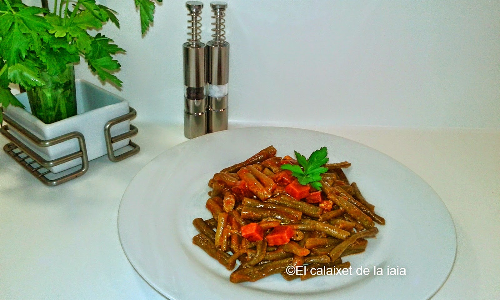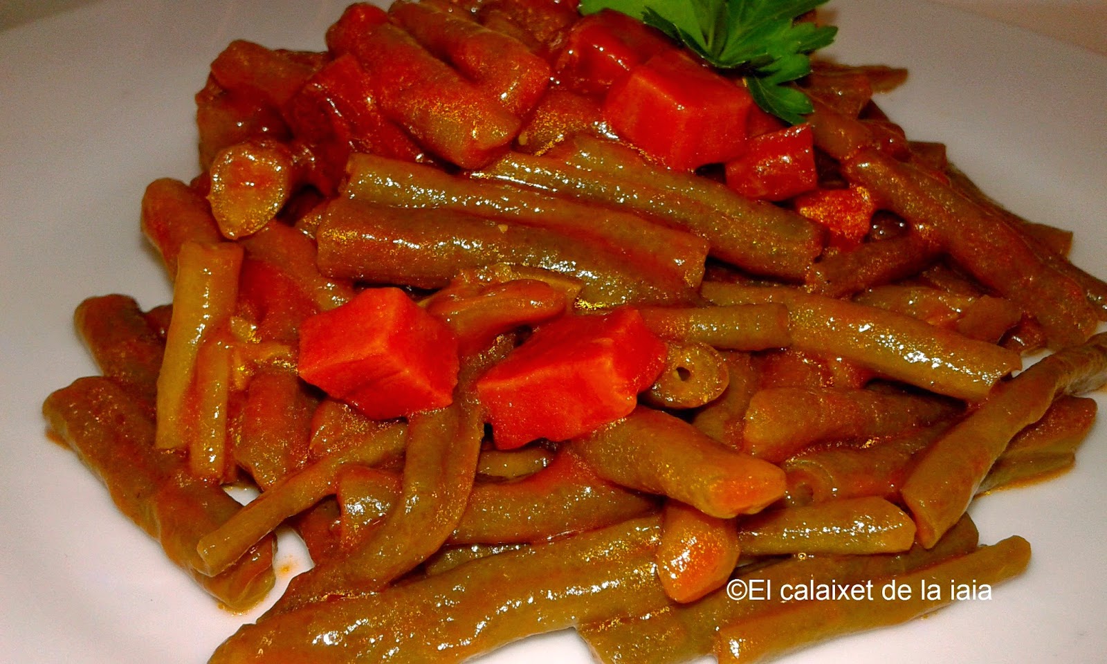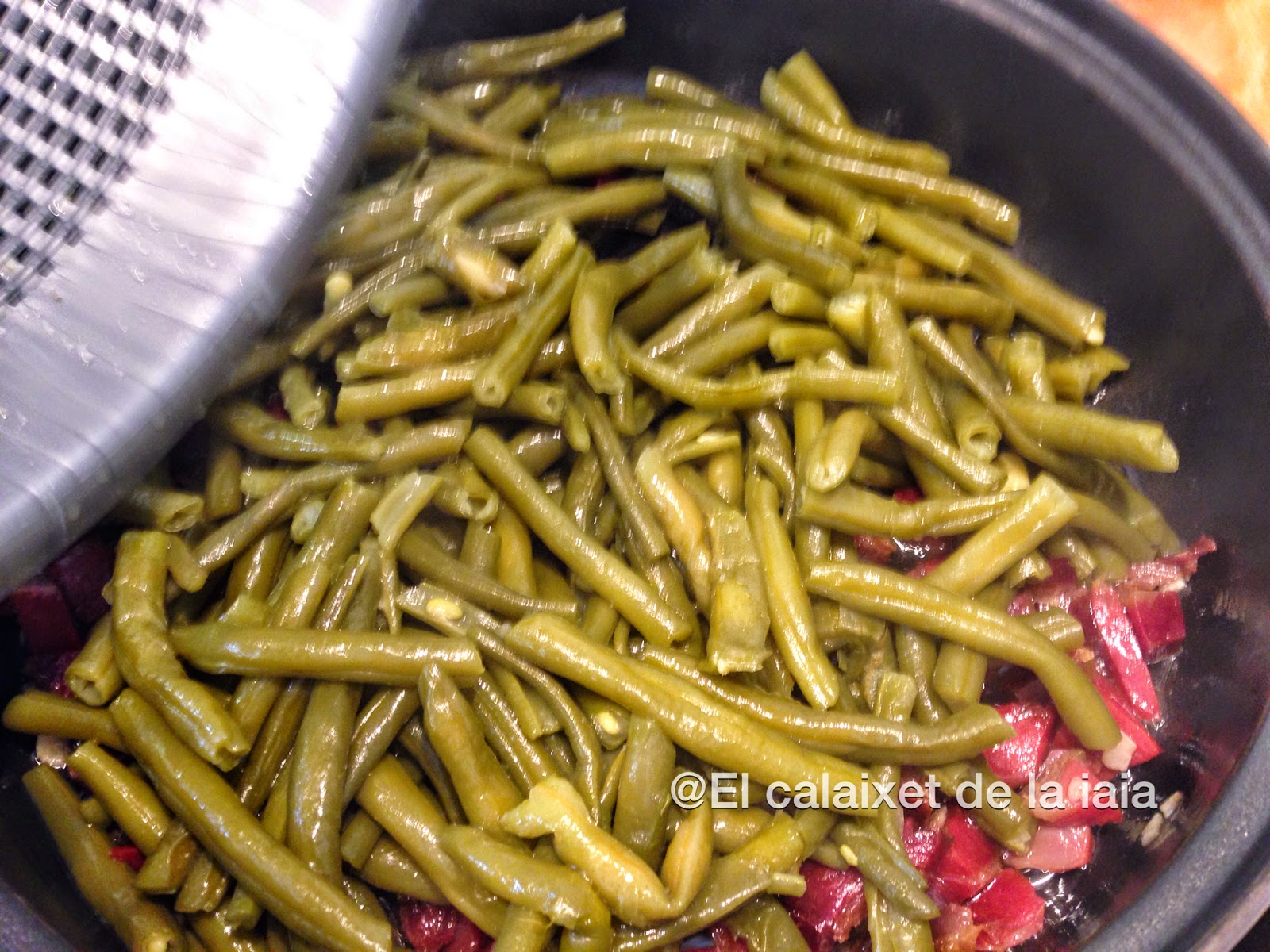 Si puedo elegir judía verdes finas de tipo boby, mejor que judía ancha, aunque lo preparo indistintamente con una u otra clase de judía porque a veces la boby está a un precio imposible, igual que si puedo usar tomate frito casero, que del hago yo en conserva.
