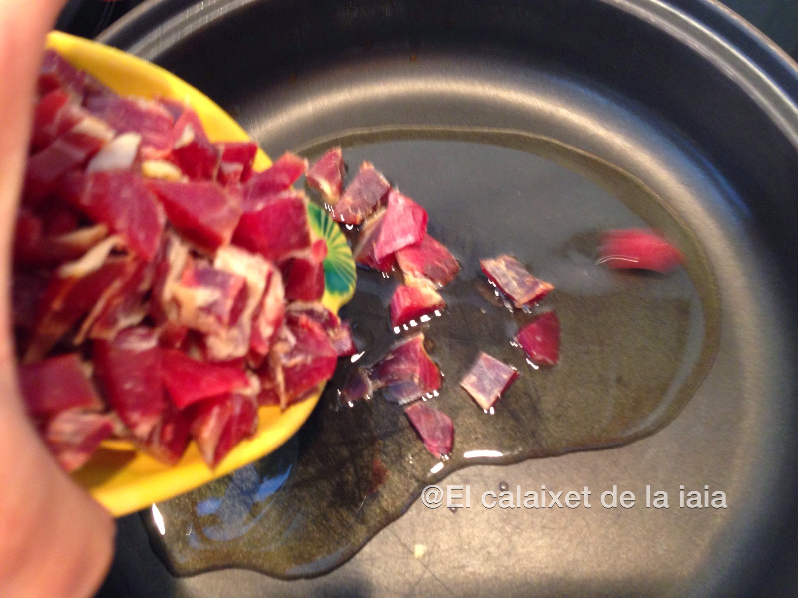 Mientras, ponemos aceite en otra cazuela o sartén y doramos un poco el jamón
