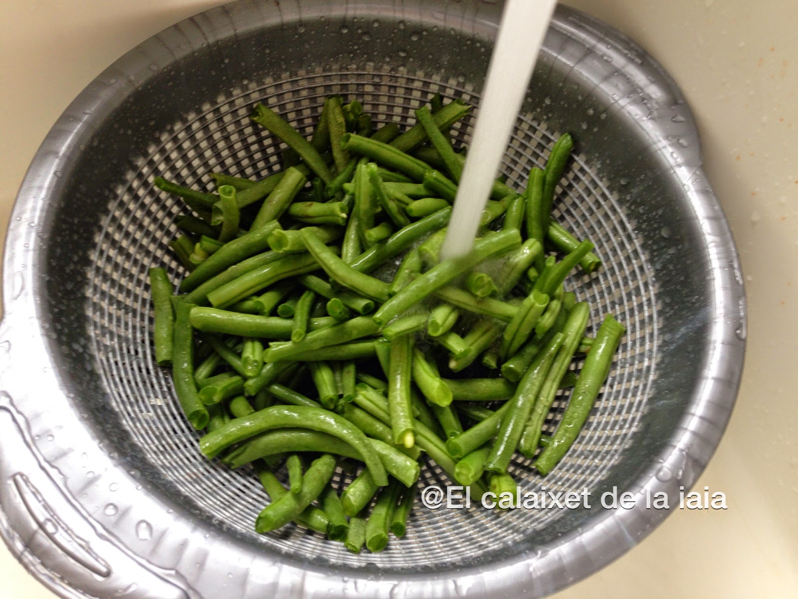Quitamos la puntas a las judías, las partimos por la mitad y las enjuagamos bien a fondo