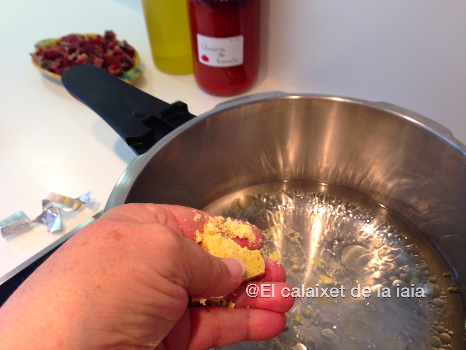 y añadimos una pastilla de Avecrem de pollo y unas gotitas de aceite de oliva. Si no queréis añadir Avecrém podéis poner una cucharadita de sal, pero en casa, siempre añadimos Avecrém porque le da un sabor riquísimo