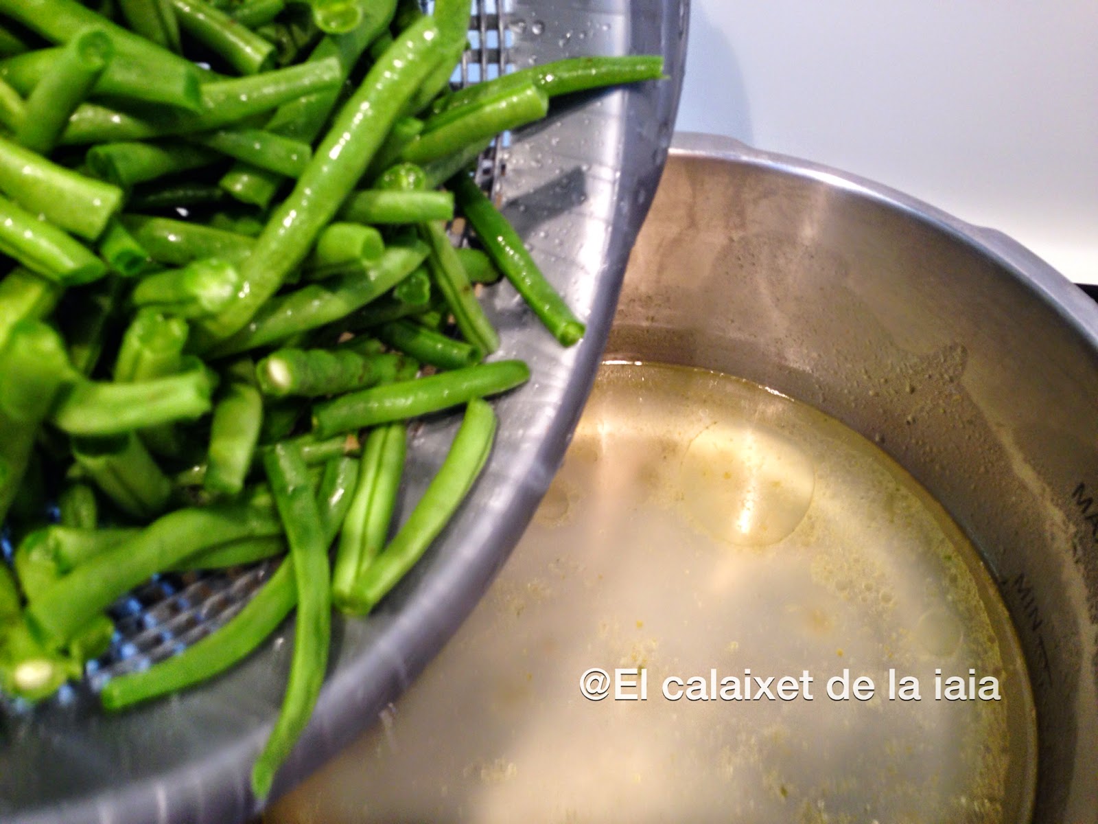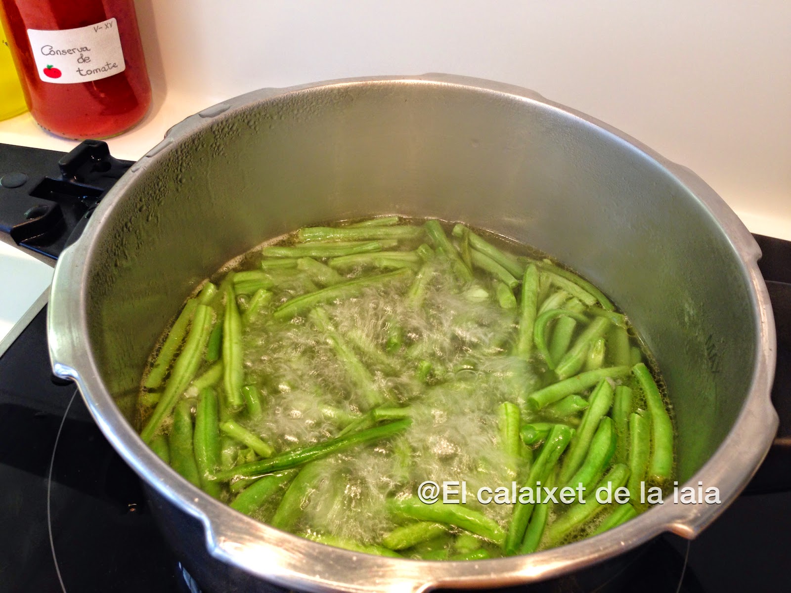 para potenciar el color verde añado una puntita cuanto apenas de bicarbonato de sodio, que no aporta sabor alguno, `pero da un coloor verde y brillante. Tapamos la olla y ladejamos unos ocho minutos a partir de que salga la válvula. Estas judías no han de quedar blandas, el punto ideal es al dente porque luego con el tomate se acaban de hacer