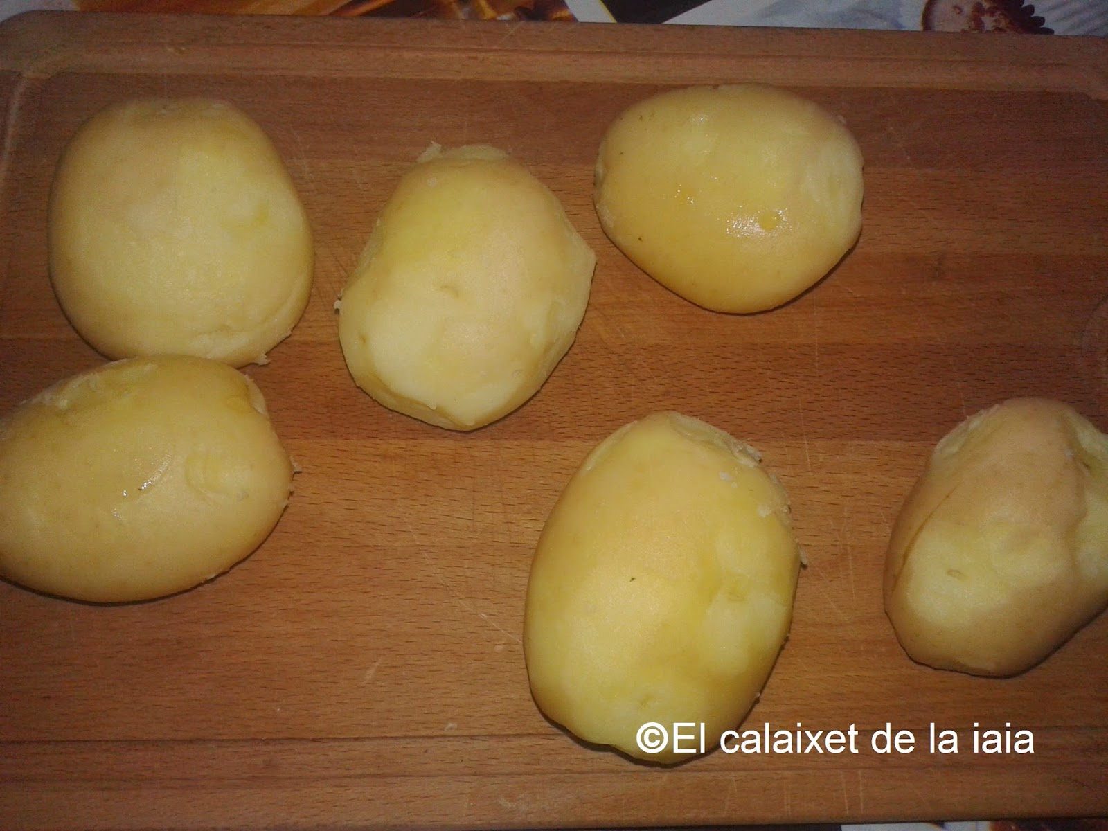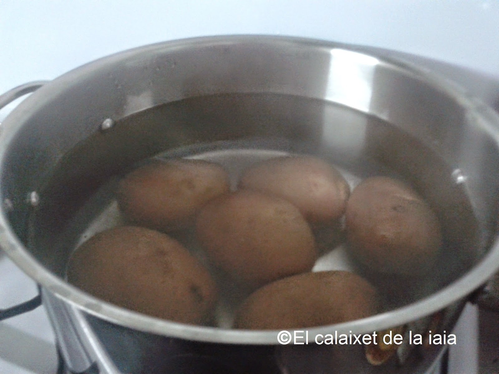 Lavamos las patatas y las pones en agua a hervir con un poco de sal durante unos 30 o 40 min, depende del tipo de patata, cuando las pinchéis y no ofrezcan resistencia, las apartamos del fuego, y las dejamos enfriar