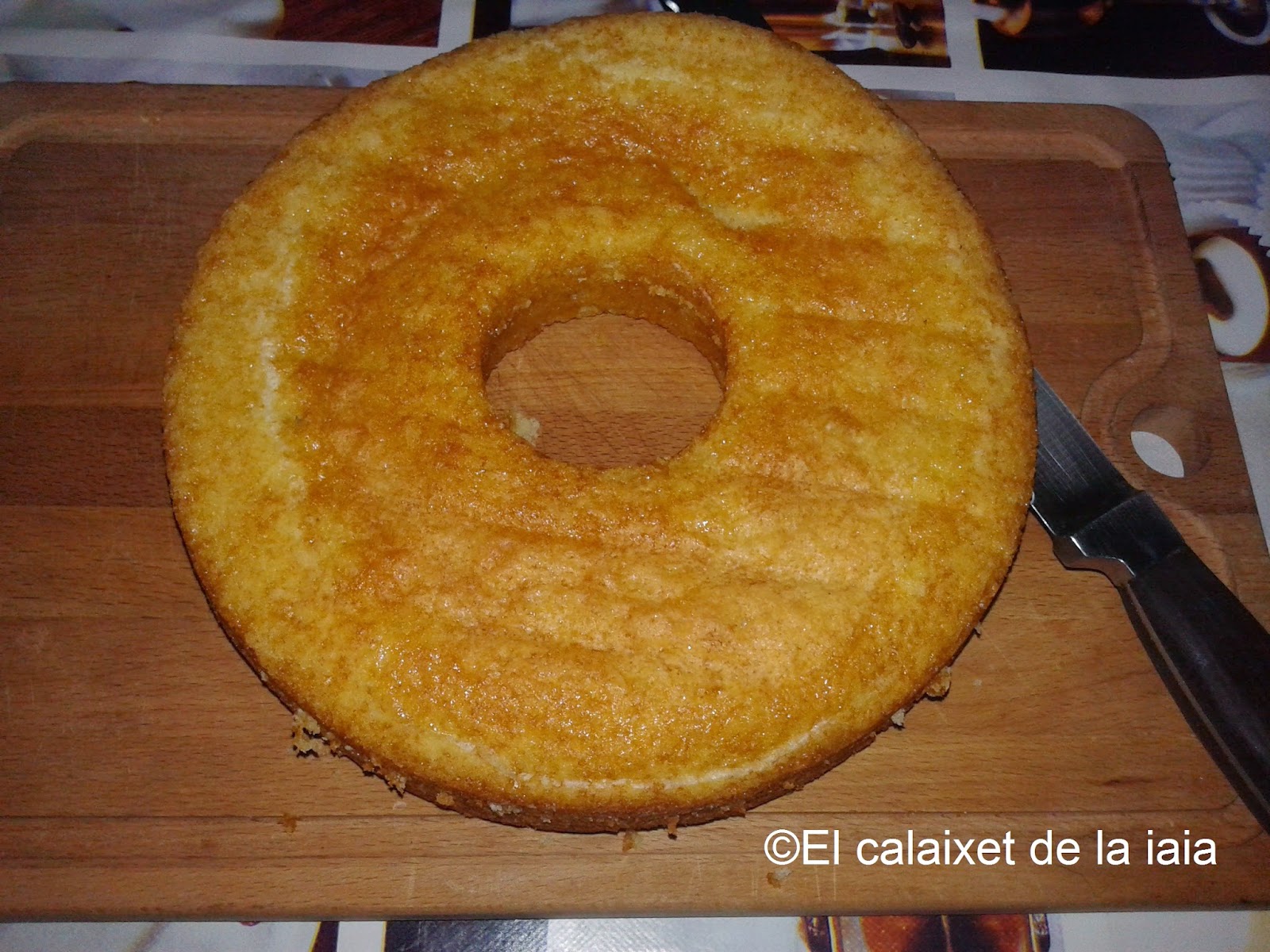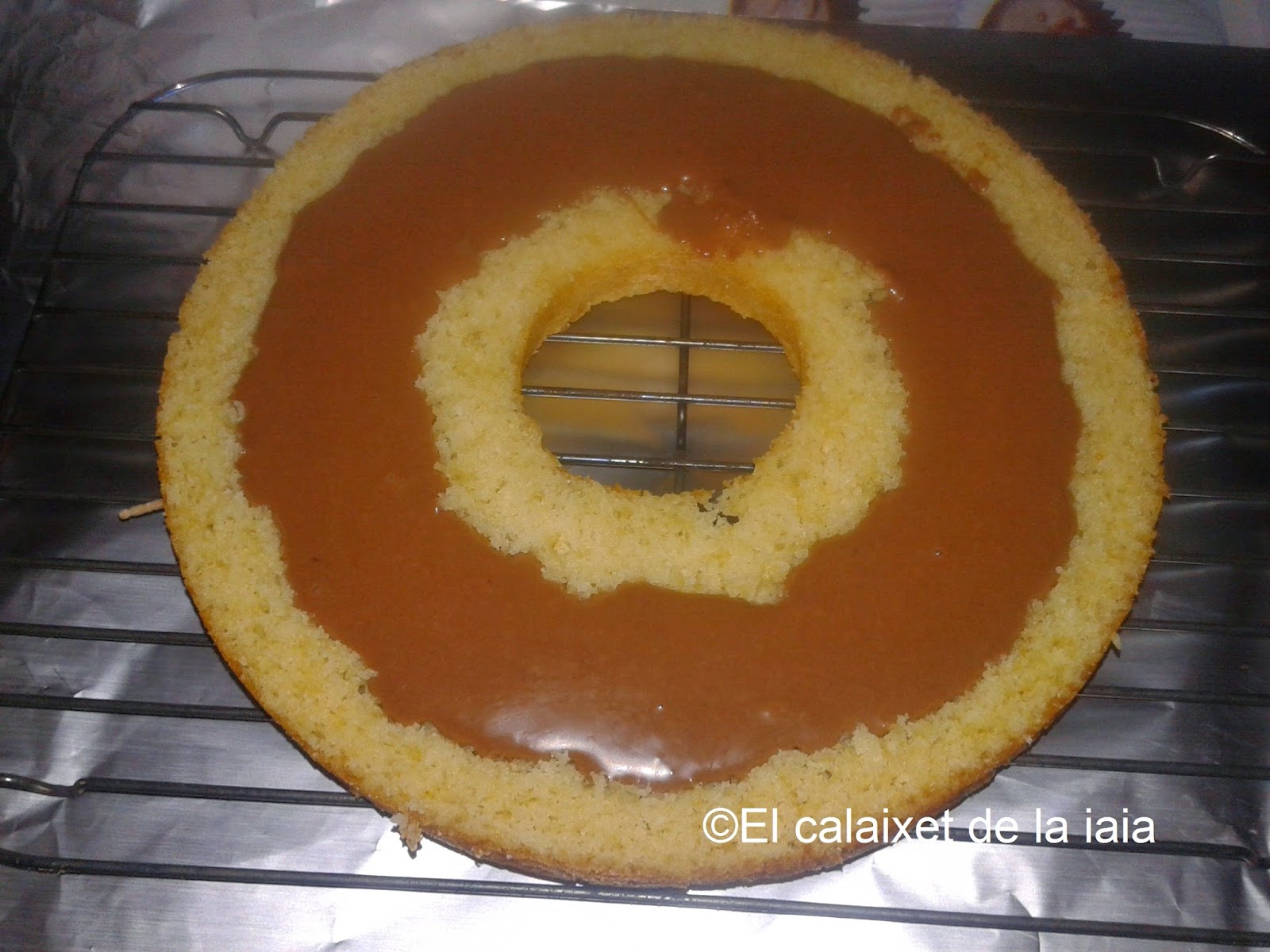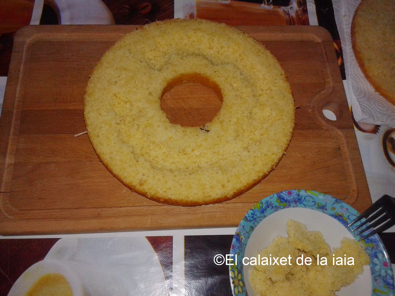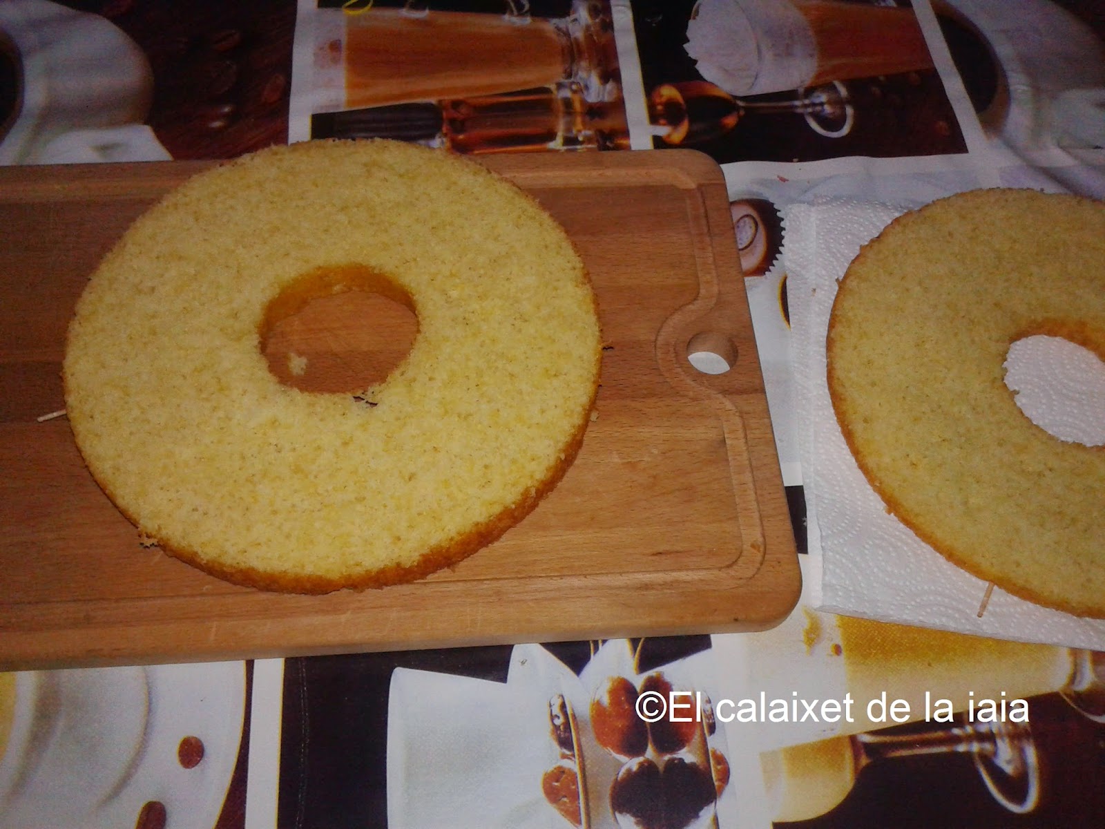 con ayuda de un tenedor vaciamos el disco de bajo haciendo un canal, el bizcocho que quitemos queda riquísimo con unas natillas por ejemplo….