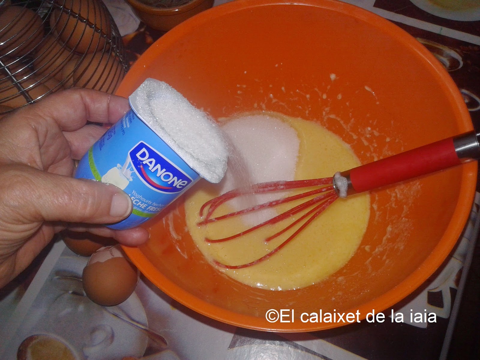 Batimos los tres huevos en un cuenco y añadimos el yogur