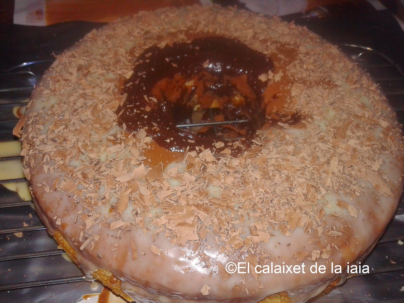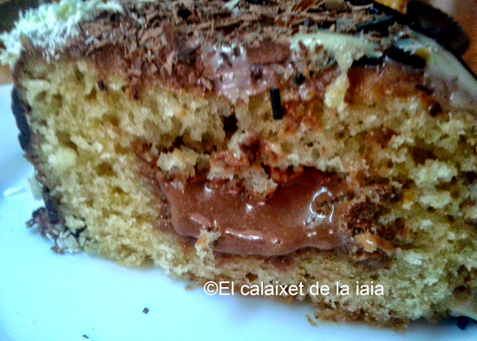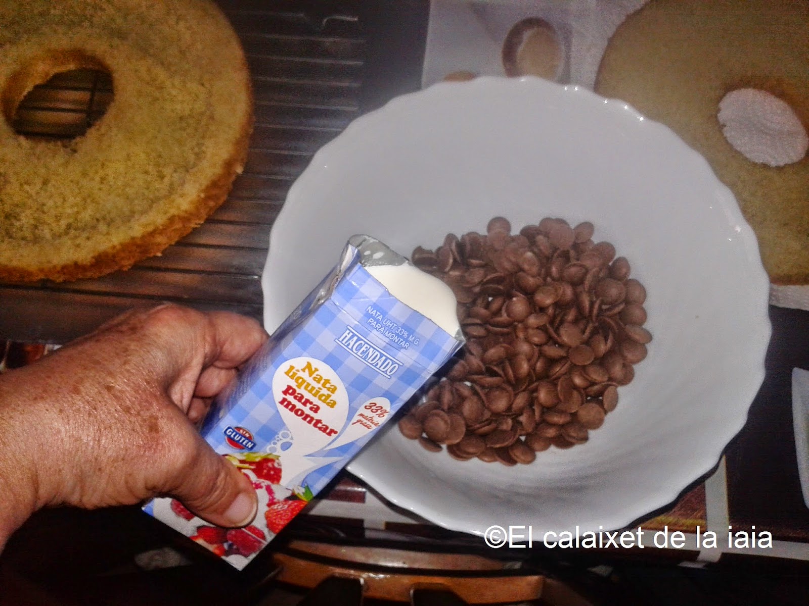 con éste chocolate con leche, rellenamos el surco que hemos hecho en el bizcocho