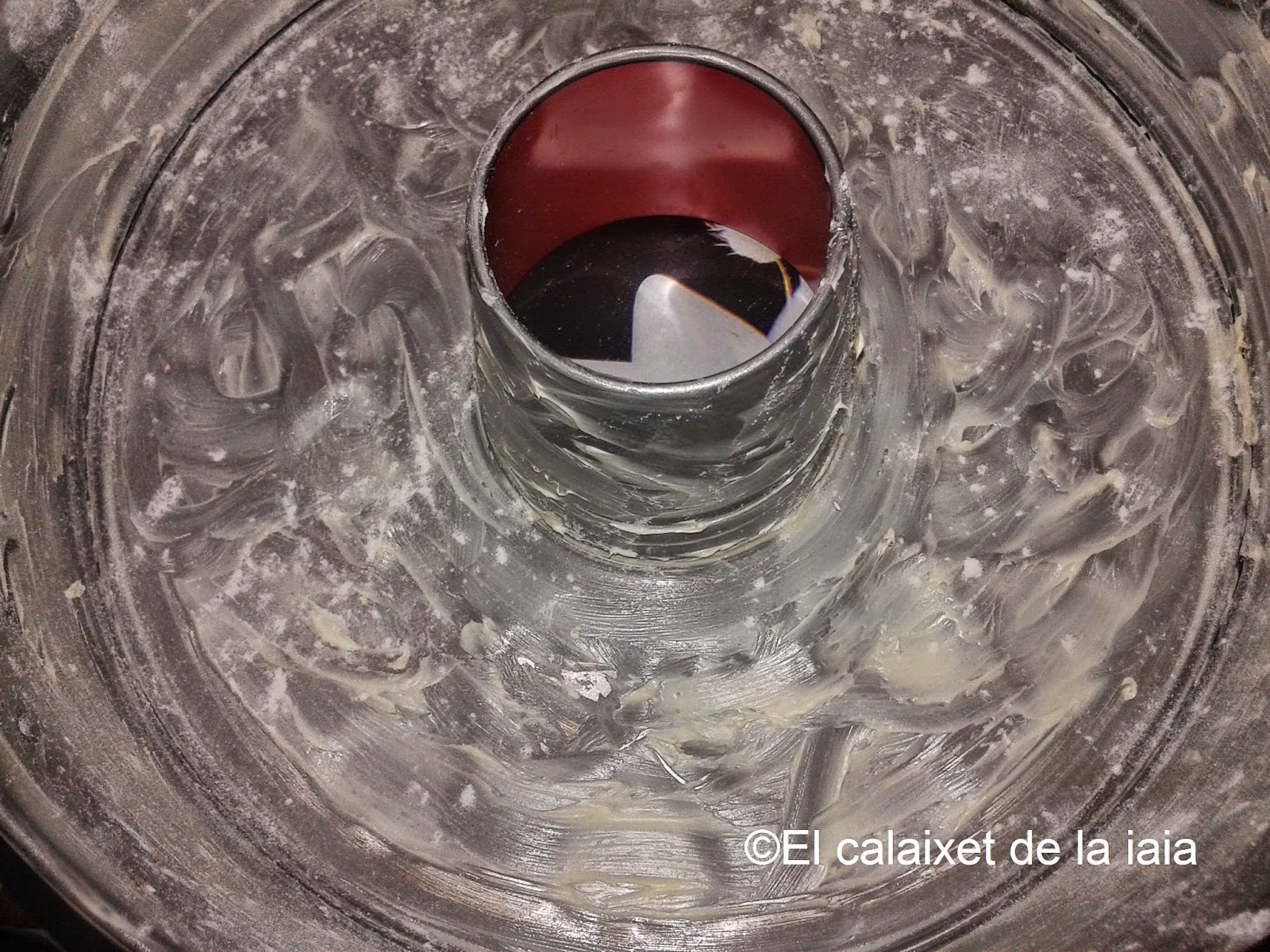 untamos el molde con mantequilla y espolvoreamos de harina para facilitar el desmoldado posterior. Lo introducimos en el horno precalentado, a 170º durante 35 minutos.Como siempre os digo ésto es en mi horno pero cada uno necesita unos tiempos distintos, podemos probar pinchando con un palo de brocheta y si sale limpio, el bizcocho está listo.Pero es importante no abrir el horno antes de los 20-25 minutos,de lo contrario paramos la cocción y se nos baja el bizcocho con lo cual se nos estropea.