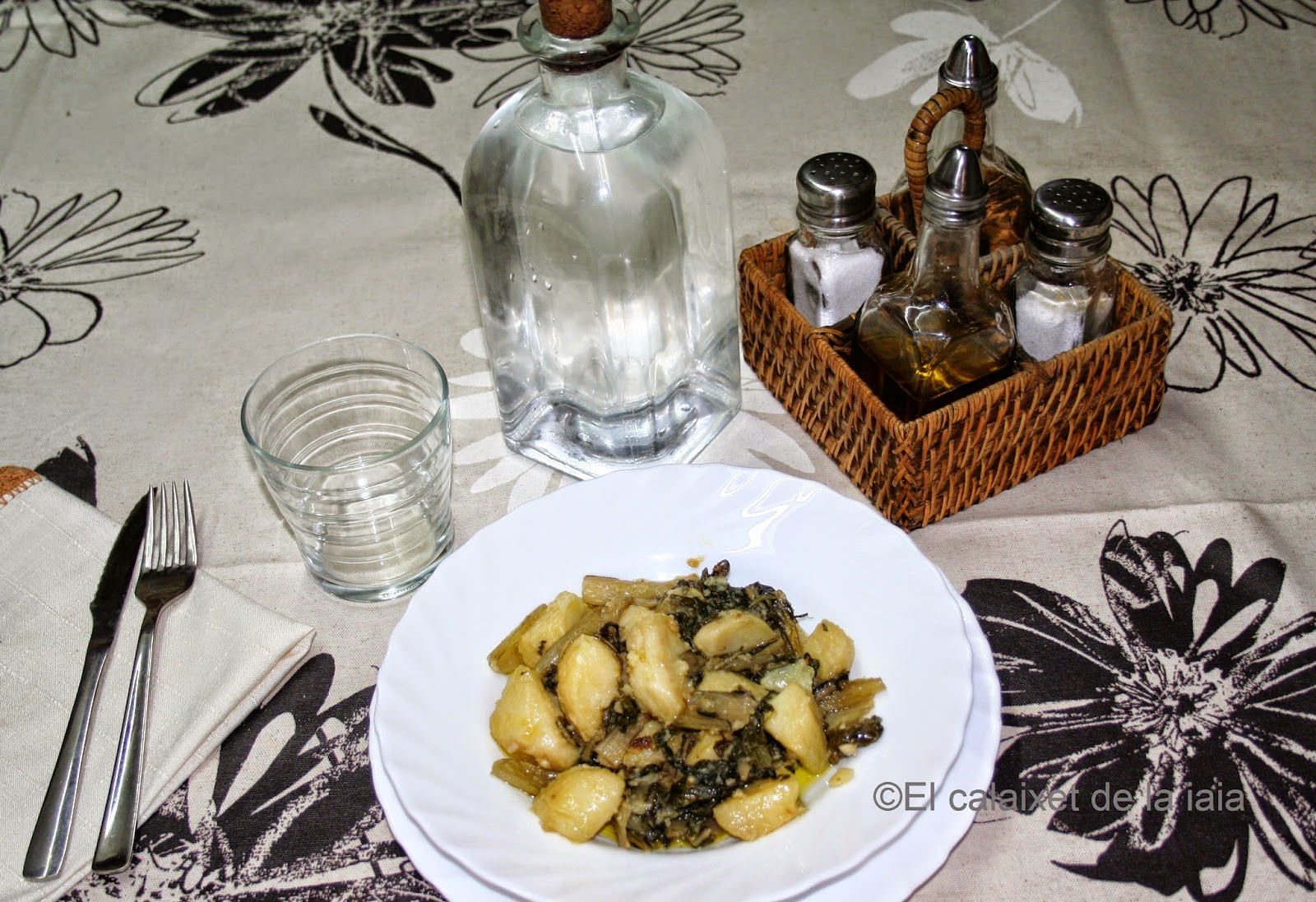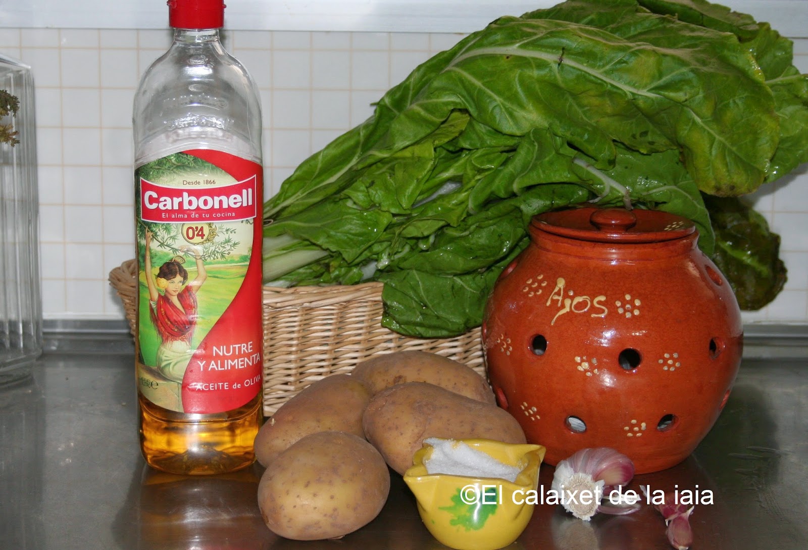 servimos acompañado de las vinagreras con aceite de oliva virgen y de vinagre de módena, para que cada cual se aderece al gusto éstas riquísimas acelgas con acelgas y patatas aragonesas, pena que aún no son del propio terrero porque aquí aún hace frío. No son las de mi suegra, pero si mi chico sonríe recordándola…ya me sirve.