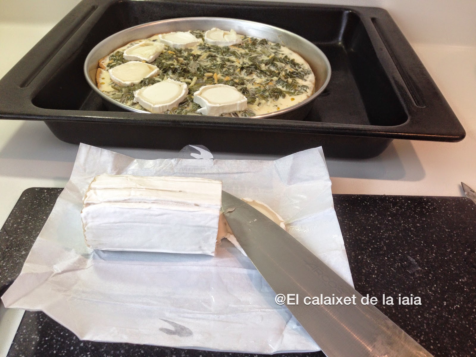 cortamos el rulo de queso de cabra, lo ideal es tener una lira, pero a la mía se le ha partido el hilo, así que lo que nos ayudará mucho será ir mojando el cuchillo con agua entre rodaja y rodaja para poder cortarlas bien y las repartimos por la superficie