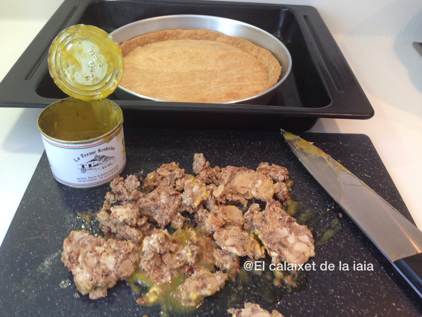 pasados los 10 min. sacamos del horno, sacamos de la lata el foie y lo trocemos para colocarlo sobre el fondo de la masa