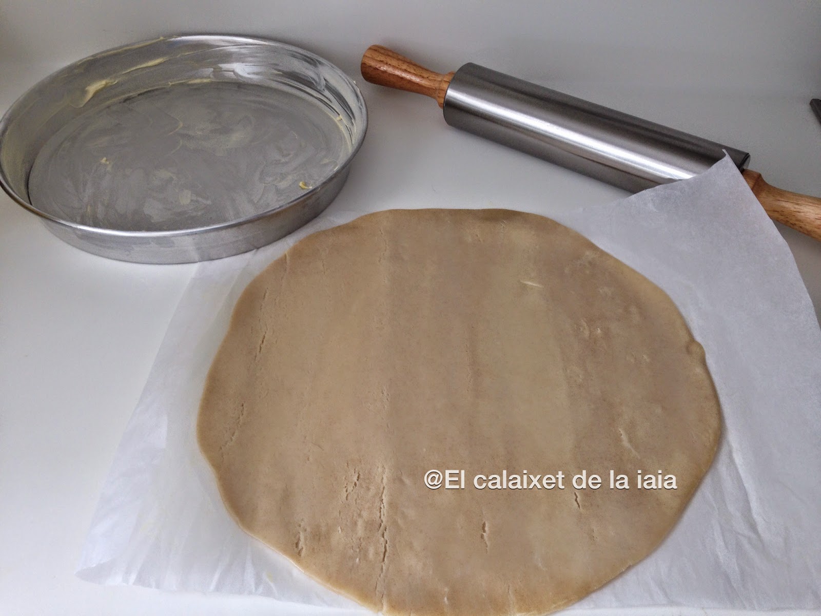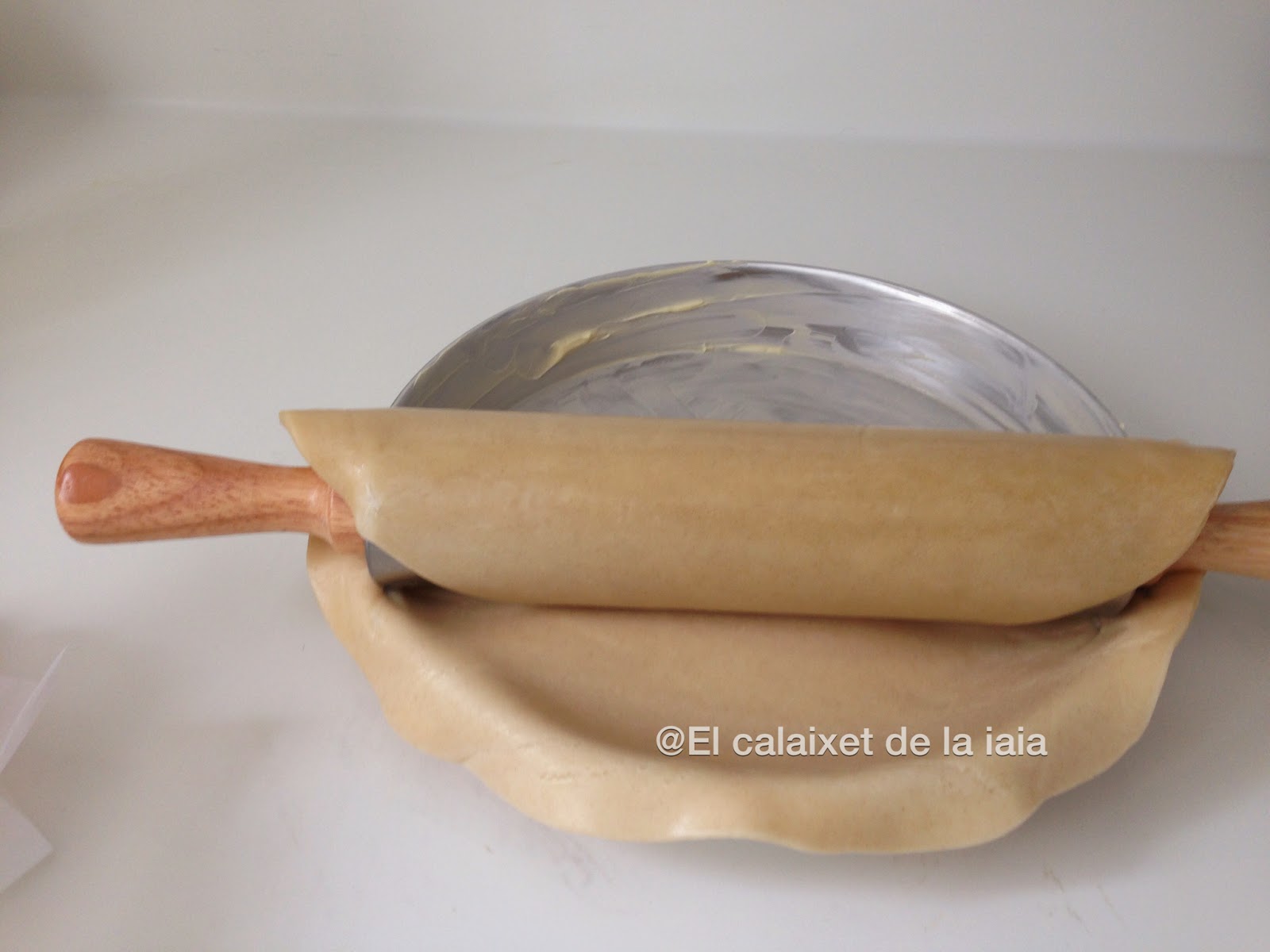 enrollamos la masa en el rulo amasador para desplazarla fácilmente y la colocamos sobre el molde