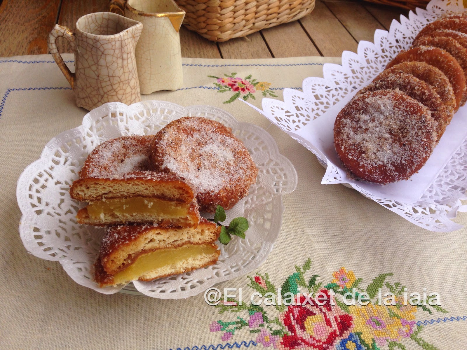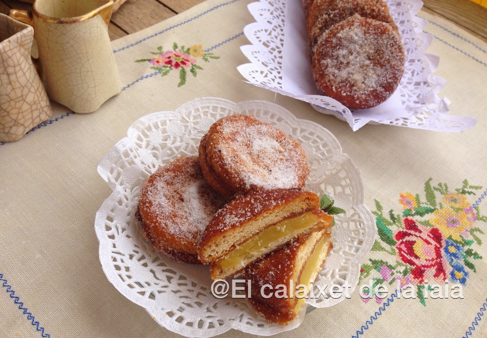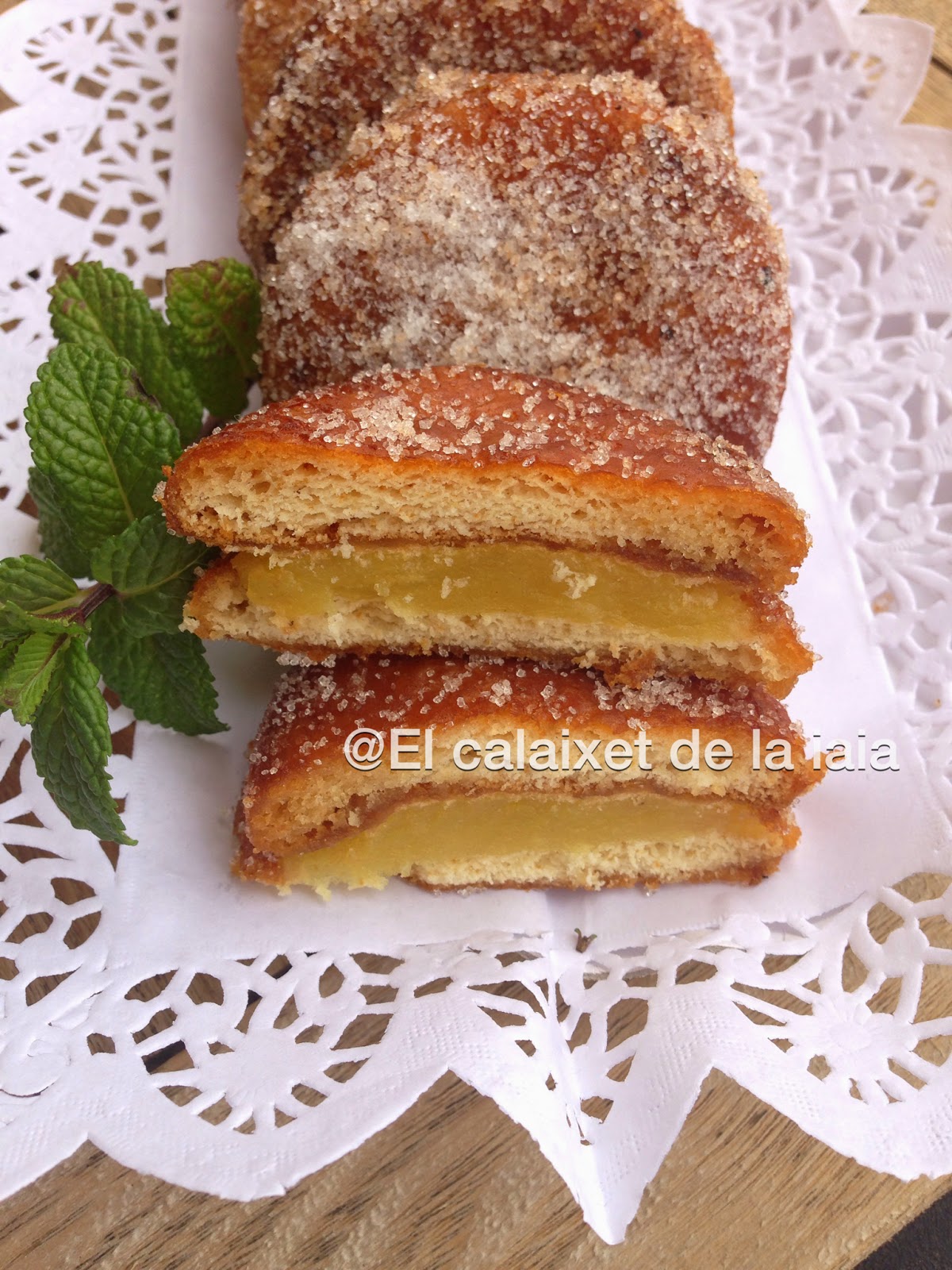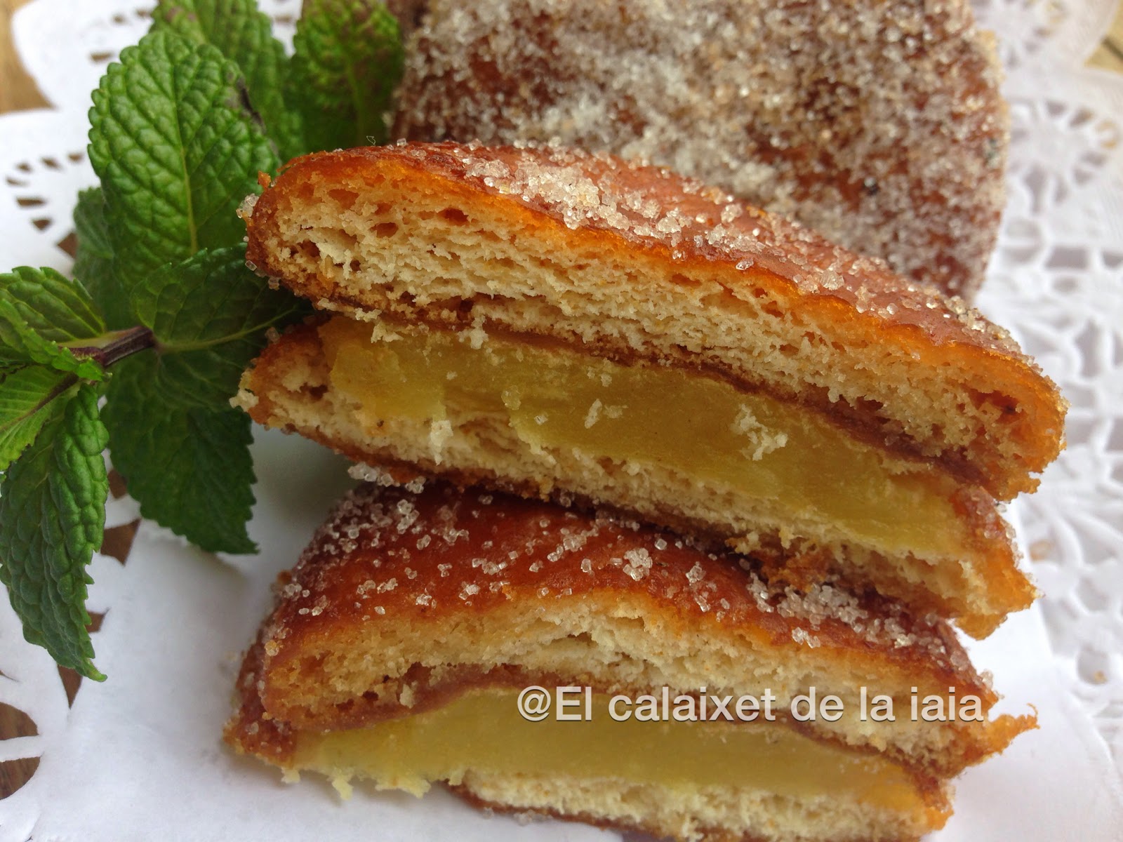 Si hay recetas que me transportan a la niñez, ésta es una de ellas.¿Quien no ha comido galletas fritas? Mi iaia Conxeta las hacía como nadie, solo que ella no las rellenaba de crema pastelera si no de un espeso flan que preparaba con Flan Chino Mandarín. Tenía que ser de ésa marca, mi iaia no admitía ni el Potax ni ningún otro, lo malo es que yo me acostumbré al sabor y tampoco admito otro que no sea el Mandarín aunque me cuesta mucho de encontrar ya que Mercadona ya no lo tiene y he de ir a los mercados.