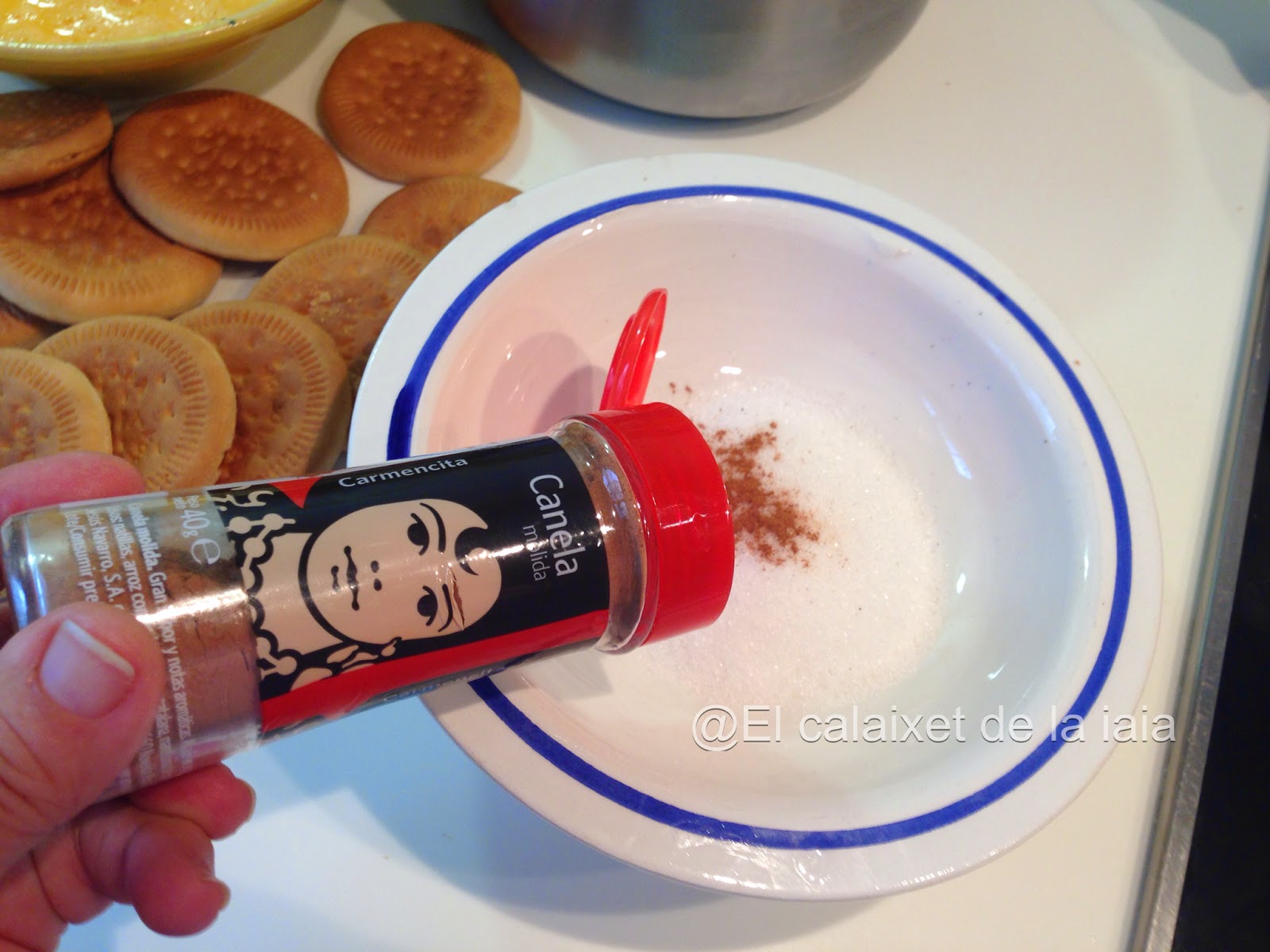 Preparamos en un cuenco azúcar y canela molida para rebozar las galletas al final