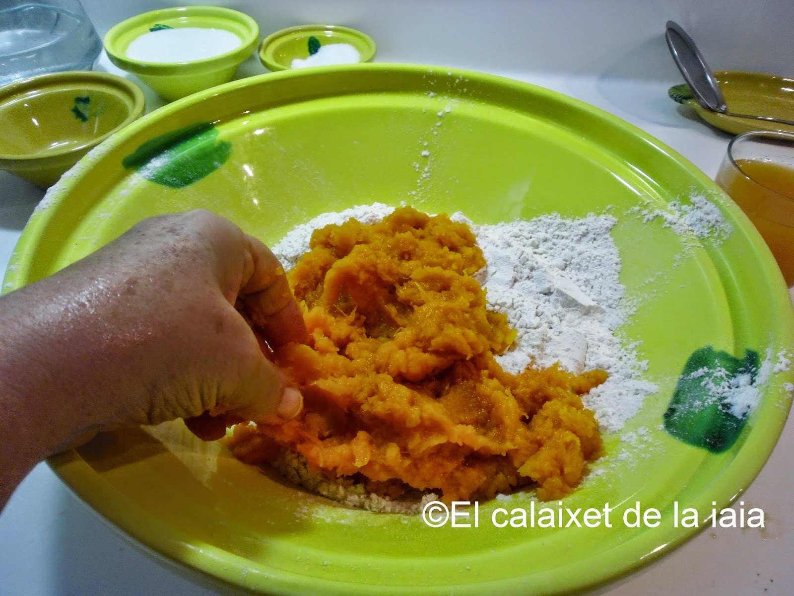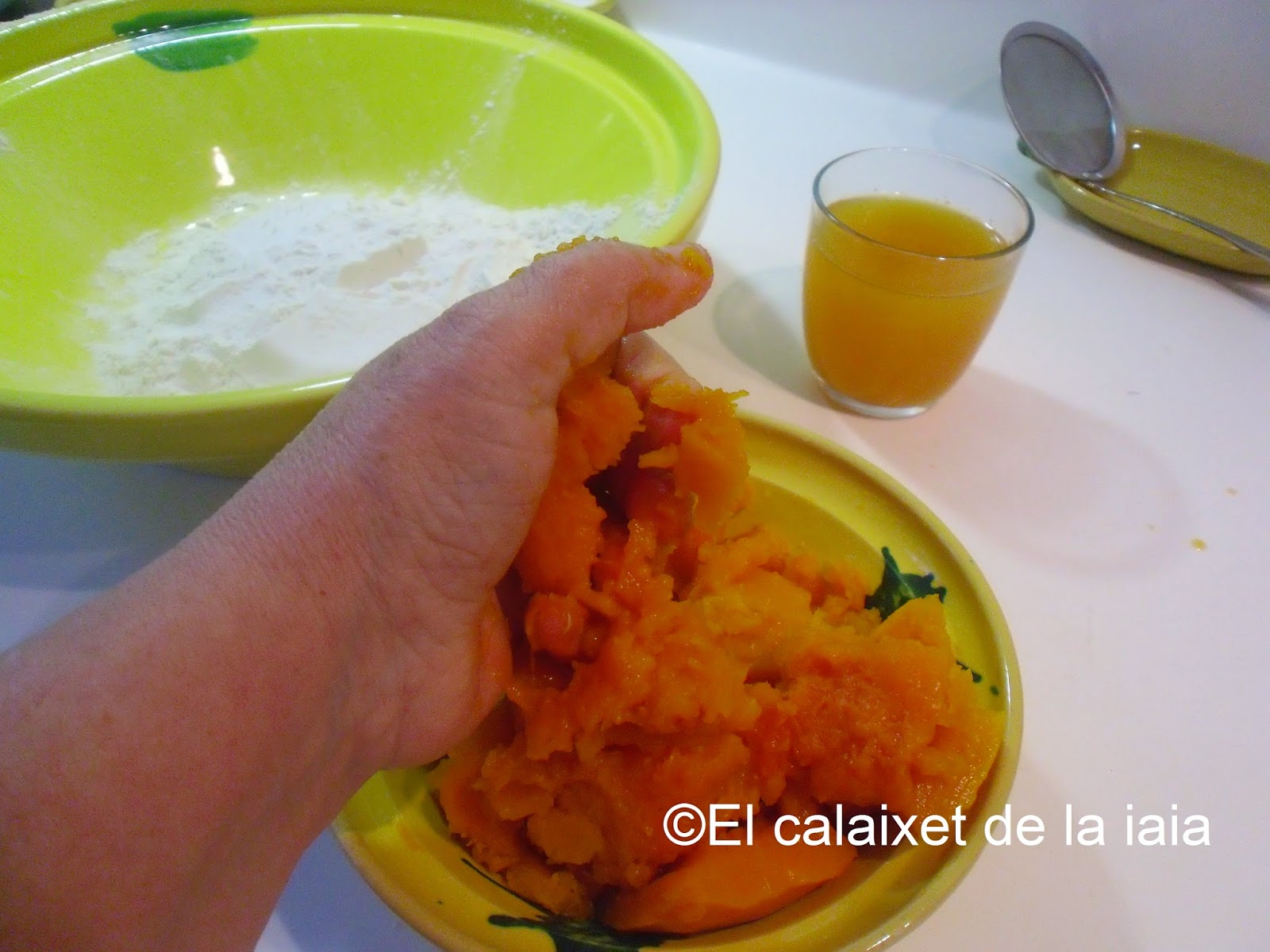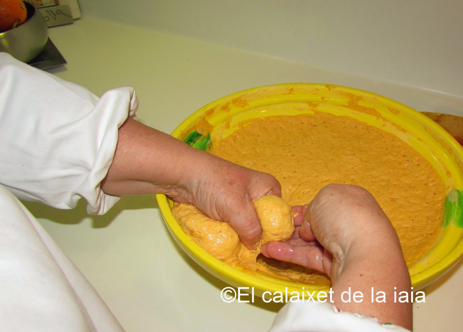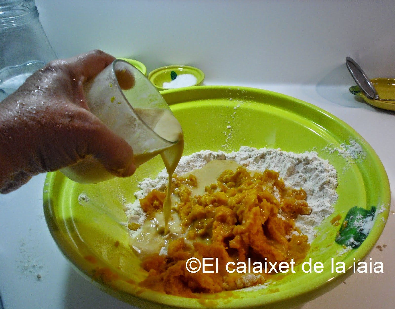 Ésta es la receta tradicional antigua de mi iaia Isabel, por tanto no uso ni huevo, ni leche, ni ralladura de limón, ni gasificante, ni levadura química, si no «rent del forn», levadura de horno o de panadero, y recordad que la medida de calabaza es doble que de harina, pero pesada, una vez asada o hervida, y escurrida.