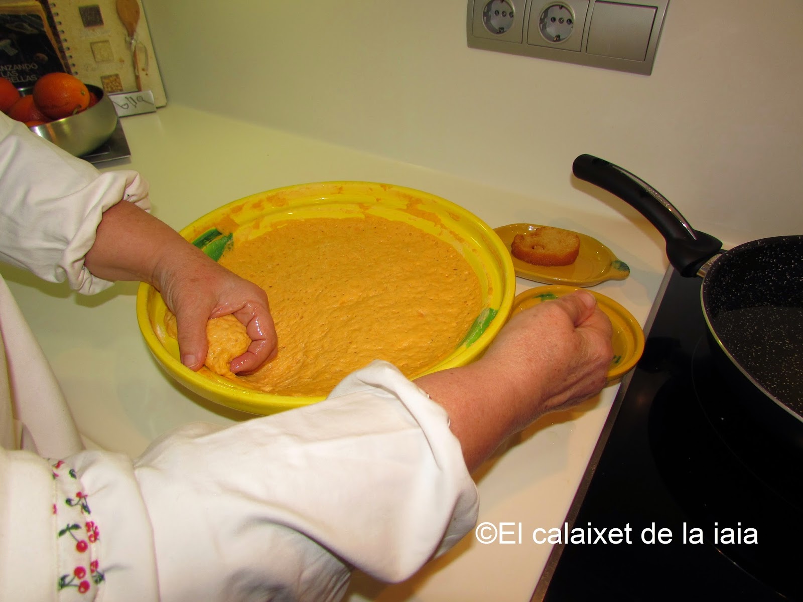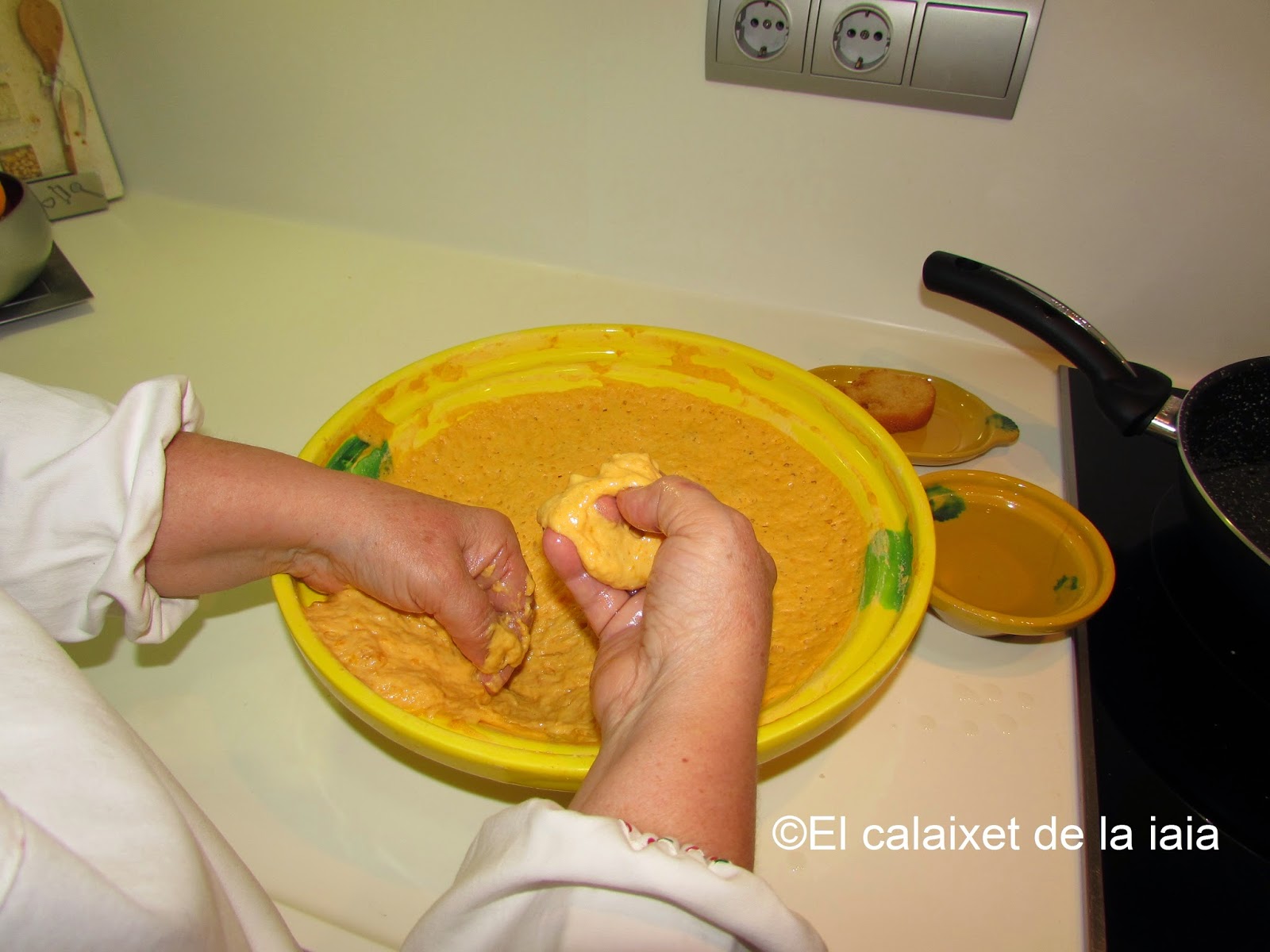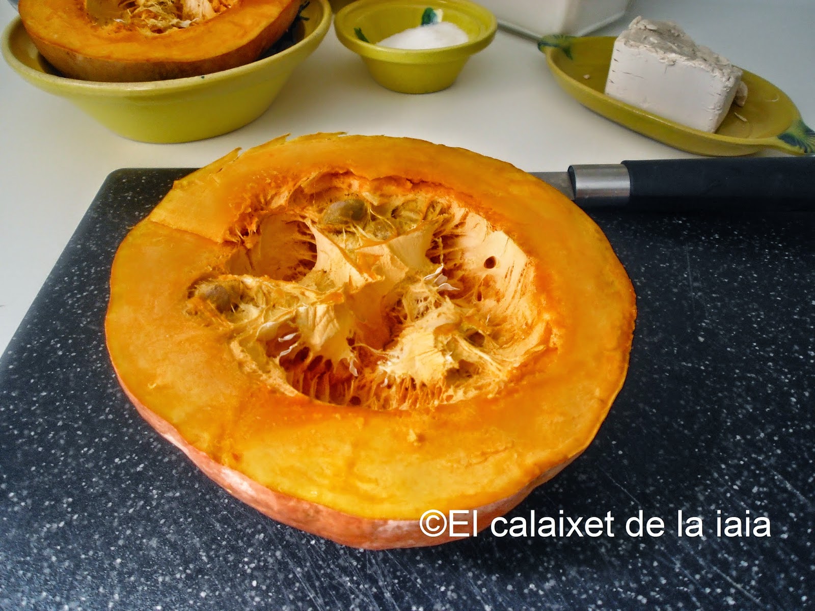 Ésta es la receta tradicional antigua de mi iaia Isabel, por tanto no uso ni huevo, ni leche, ni ralladura de limón, ni gasificante, ni levadura química, si no «rent del forn», levadura de horno o de panadero, y recordad que la medida de calabaza es doble que de harina, pero pesada, una vez asada o hervida, y escurrida.