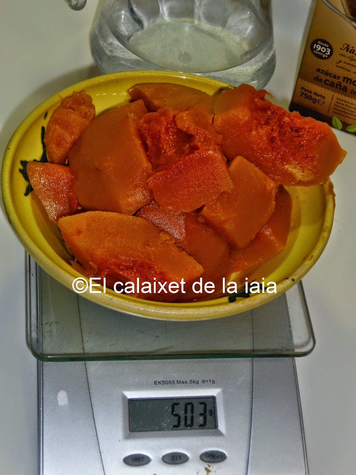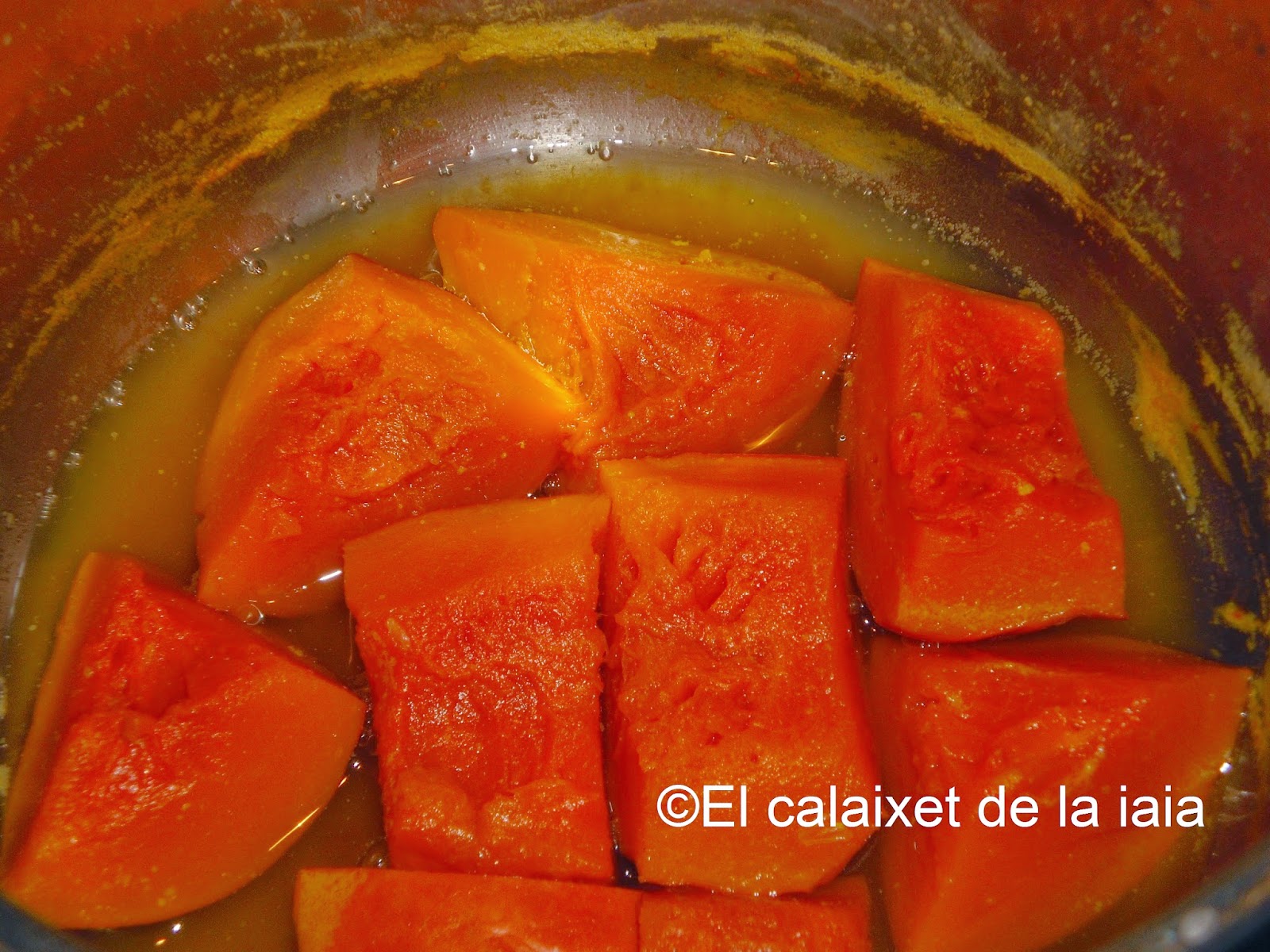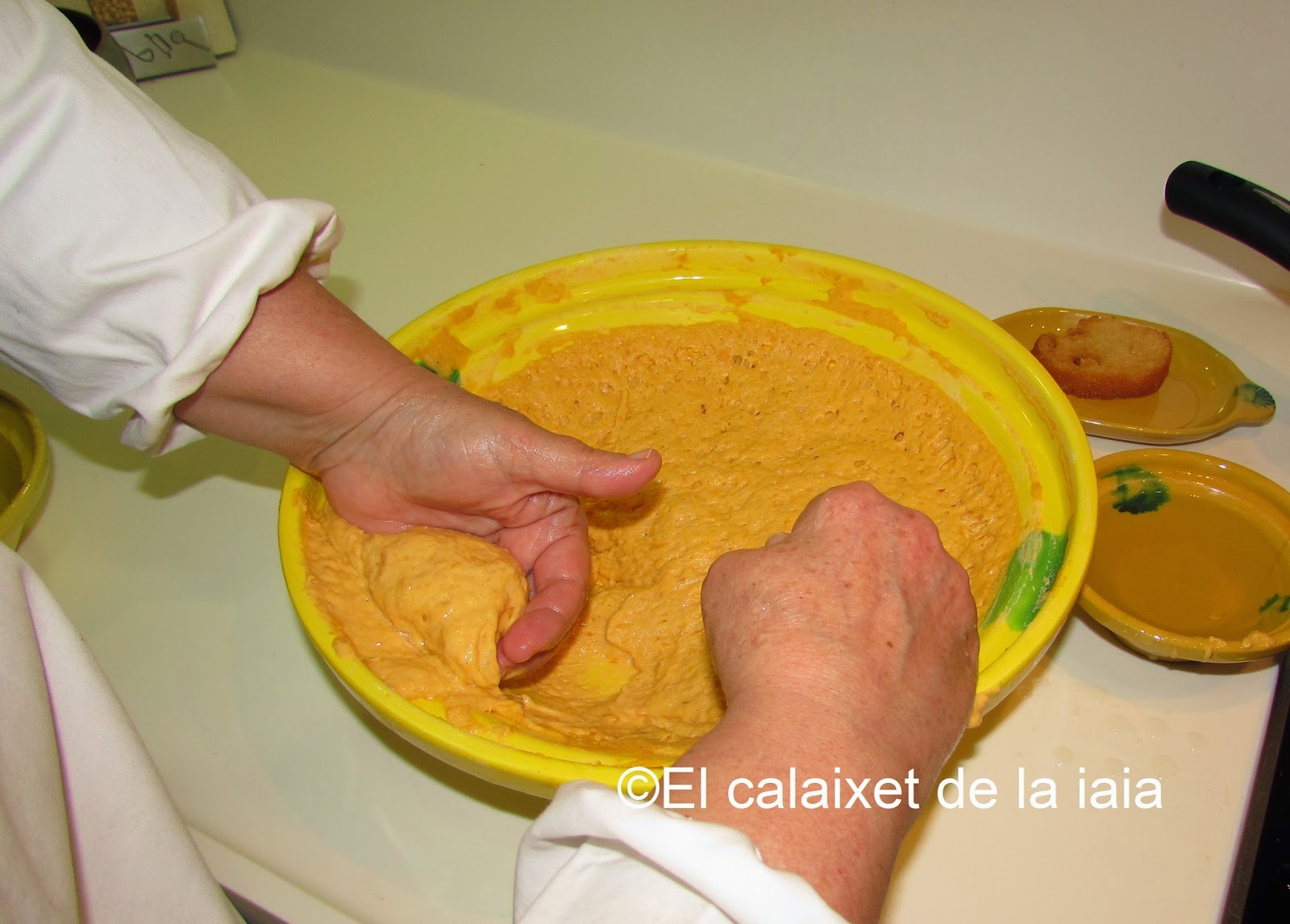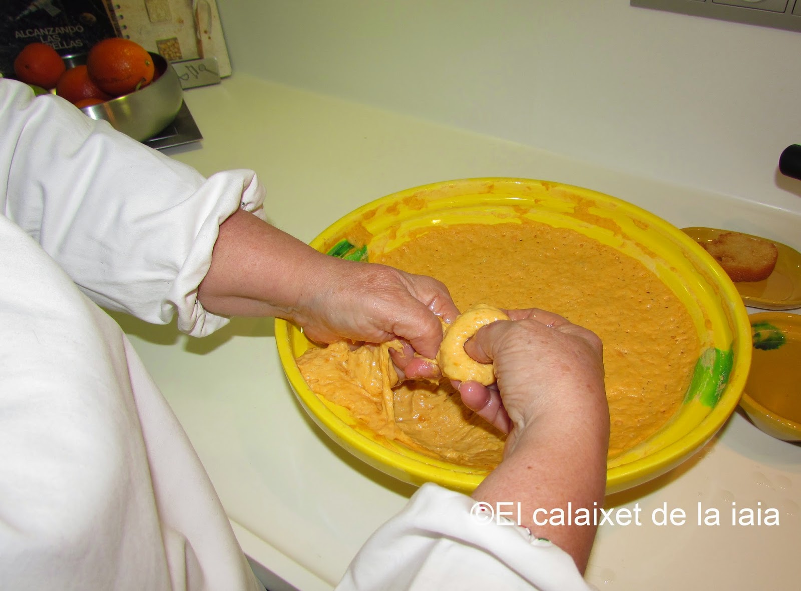 Ésta es la receta tradicional antigua de mi iaia Isabel, por tanto no uso ni huevo, ni leche, ni ralladura de limón, ni gasificante, ni levadura química, si no «rent del forn», levadura de horno o de panadero, y recordad que la medida de calabaza es doble que de harina, pero pesada, una vez asada o hervida, y escurrida.