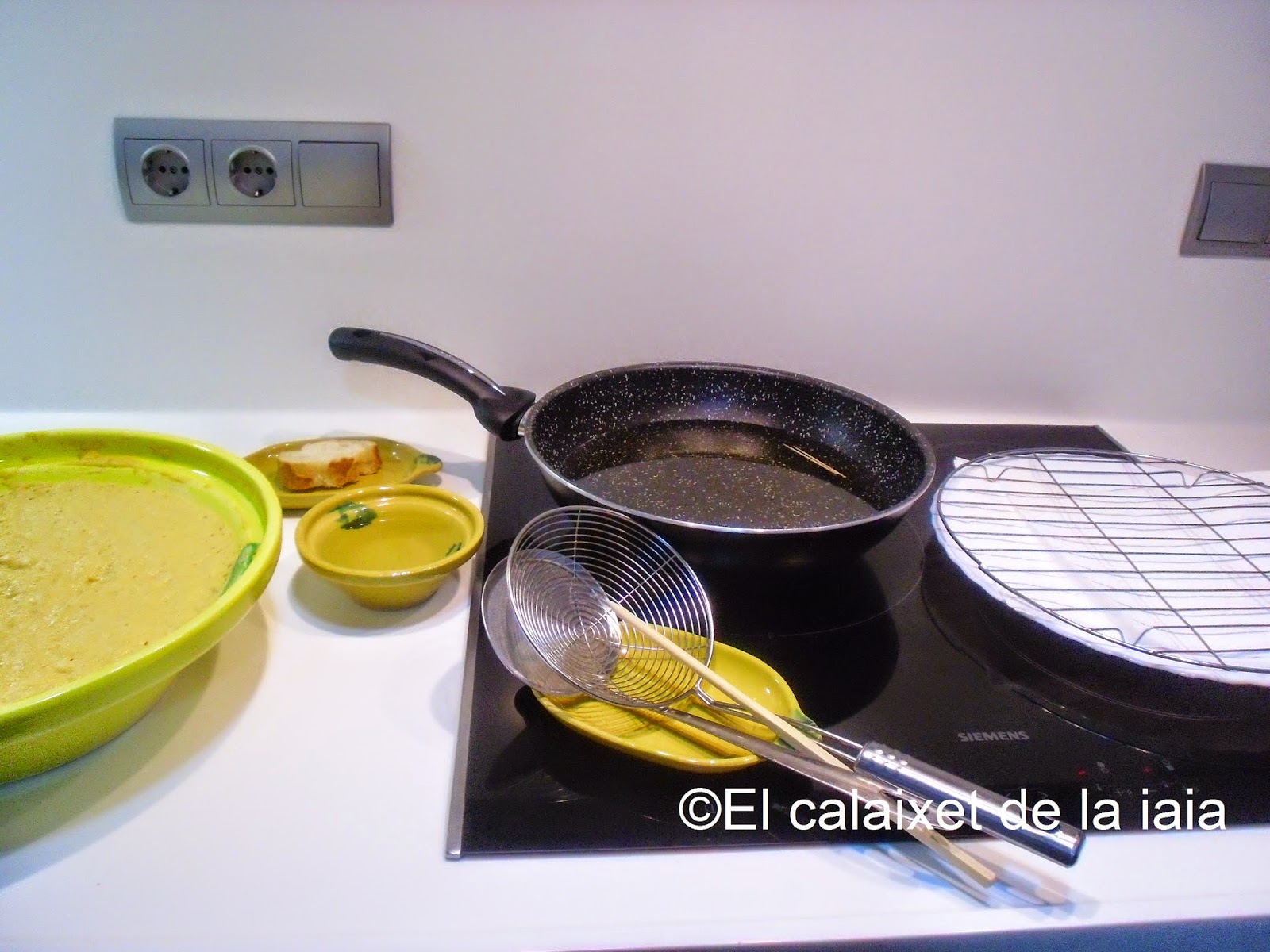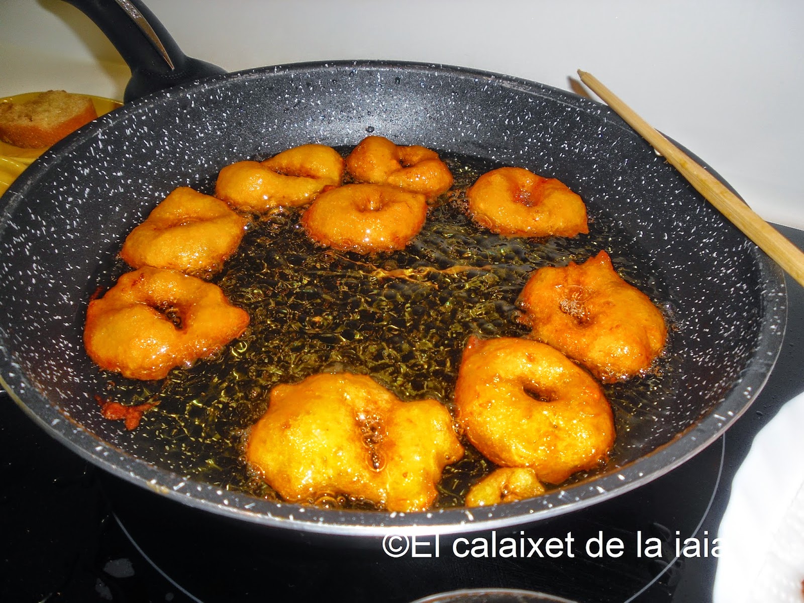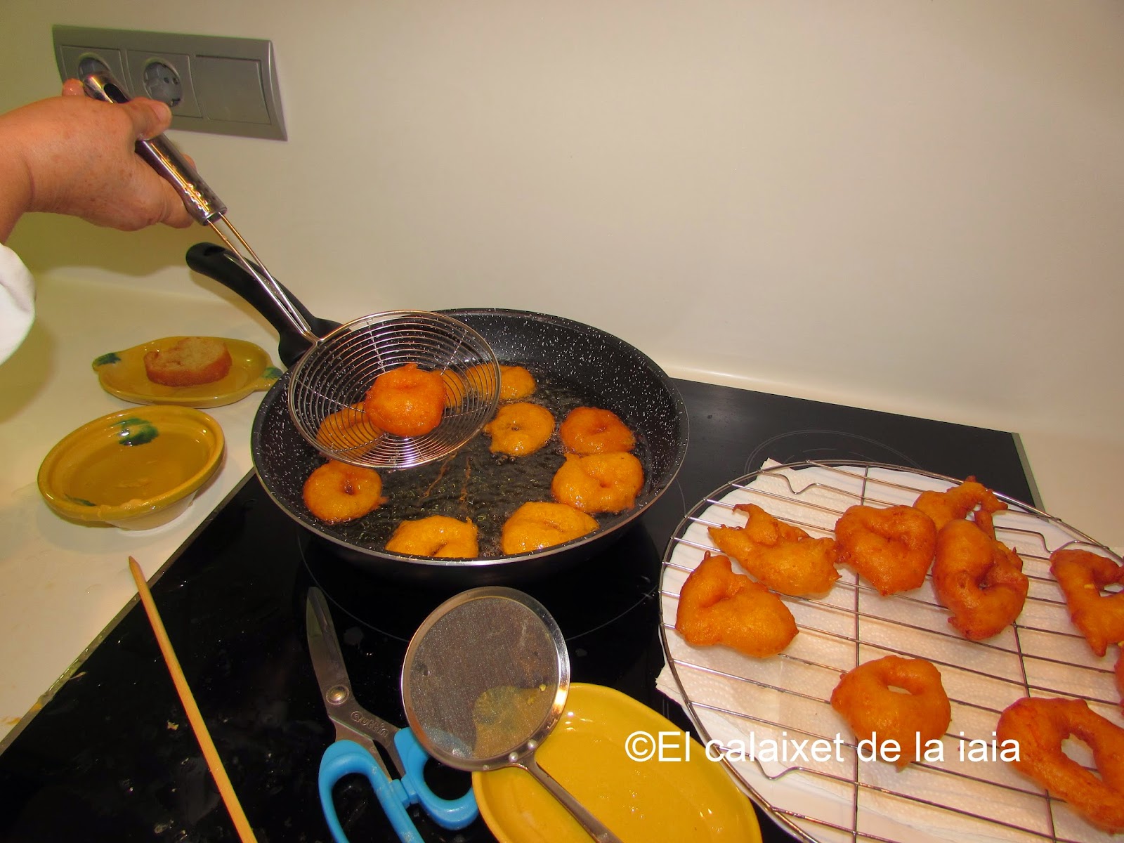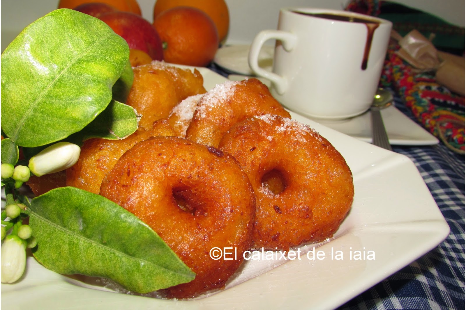 Mi receta de buñuelos, es la típica y tradicional de la iaia Isabel, que ella preparaba en aquella olla de hierro fundido sobre las trébedes y los troncos ardiendo en su cocina de suelo, con aquellos ladrillos de «tomaqueta i ou», como siempre cuenta mi padre.