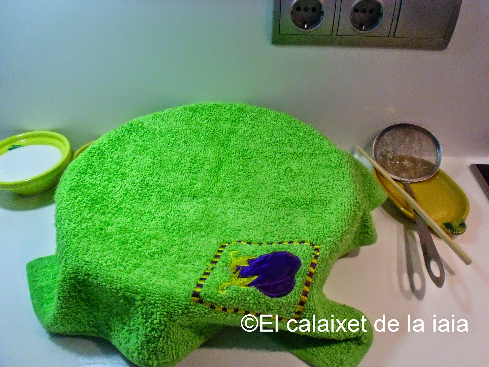 con lo que la cubriremos, mi iaia usaba una especie de manta igual que la que utilizaba para envolver el pan recién cocido, y la dejamos fermentar durante una hora mas o menos, todo depende del tiempo, y hoy hace bastante frío