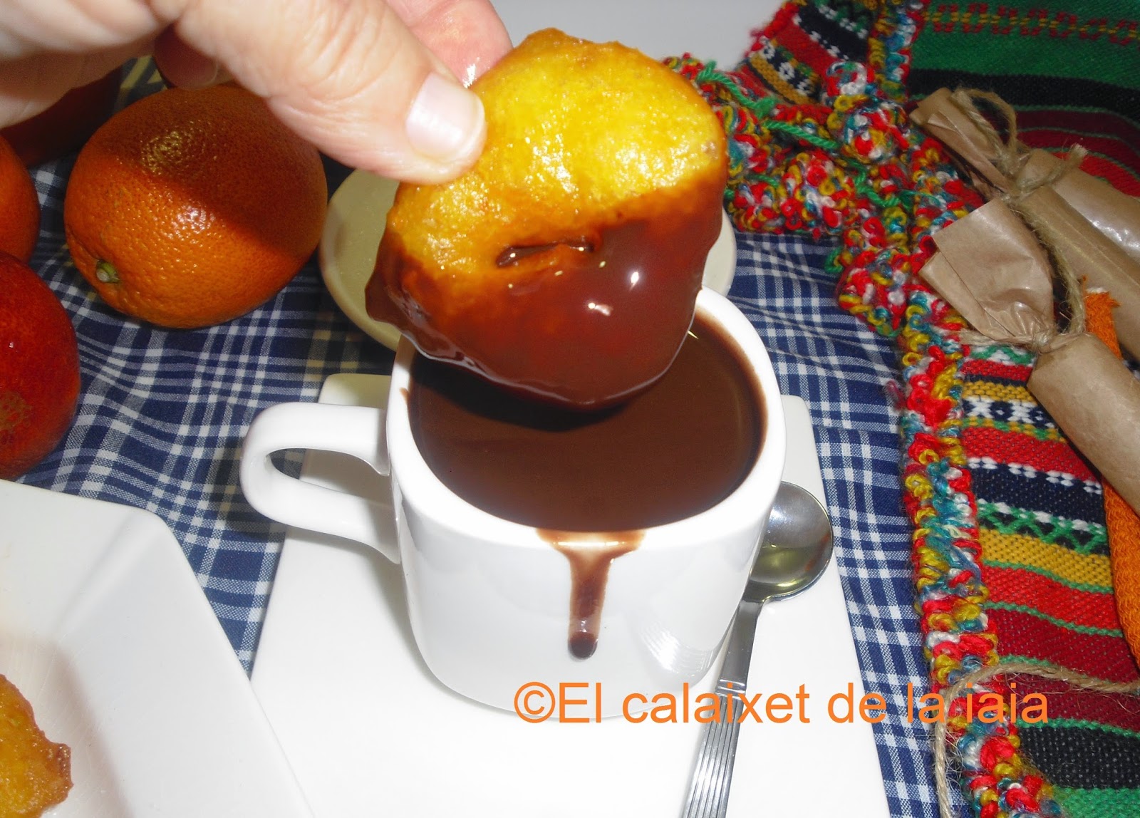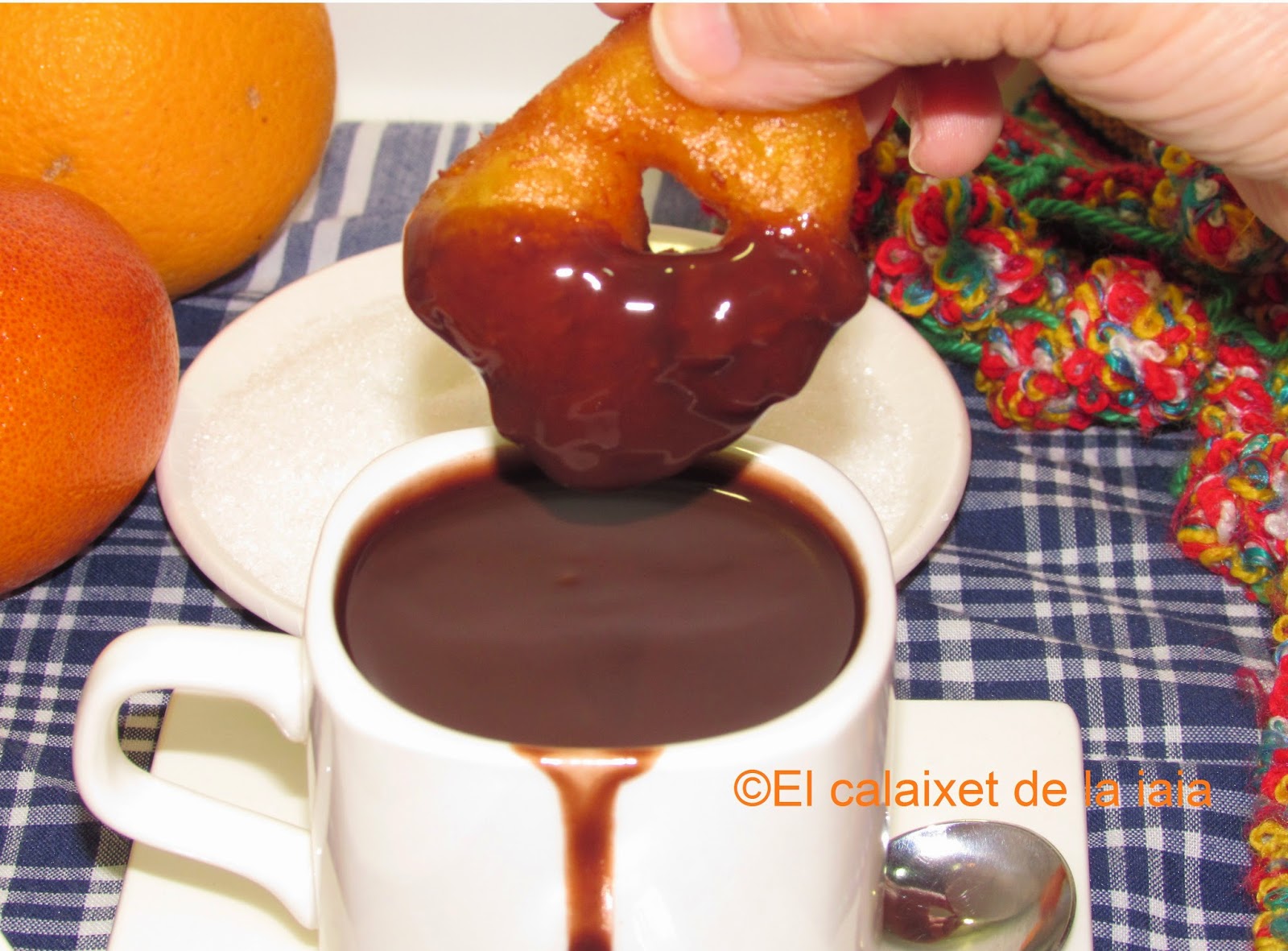 También los preparo sin calabaza, con naranja, con higos, «figues albardaes», con dátiles, incluso con horchata. Se pueden comen regados con anís, con un buen café, o mojados en un chocolate fundido, fuerte, caliente y espeso, a la valenciana.