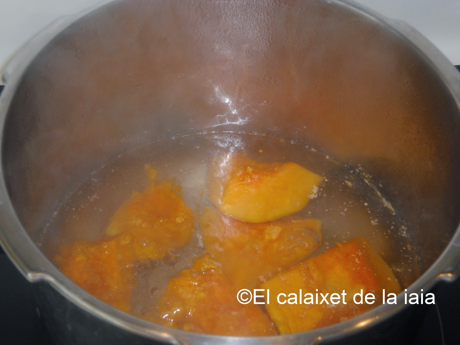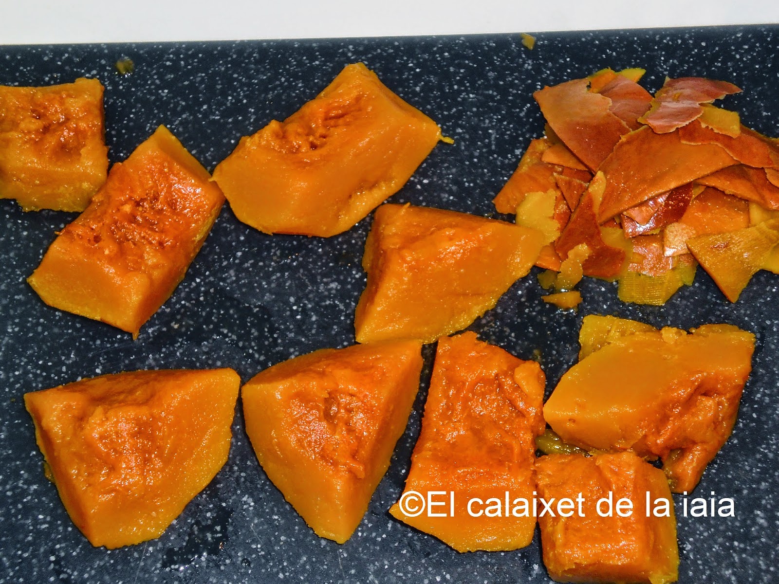 Comenzamos partiendo la calabaza, id con extremo cuidado que es muy dura y es fácil cortarse, por experiencia os lo digo, porque tengo alguna que otra señal en las manos, peeeero, tengo un súpertrucazo que facilita cortarla, de una manera IMPRESIONANTE simplemente la lavamos, y la ponemos entera en el microondas a máxima potencia, durante 3 minutos. Esta acción no afecta en absoluto a la calidad de la calabaza, solo la ablanda lo necesario, para poder cortarla sin el mínimo problema, ni resistencia. Así que ahora ya, la troceamos y podemos quitarle la piel, si la vamos a hervir o no, a nuestra elección. Yo hoy la troceo y la pongo a hervir sin quitar la piel, ya la quitaré una vez hervida. Podéis hacerla asada, «torrada al forn», (o en la estufa de leña, que sale de muerte), pero entonces no tendréis el caldito necesario para la masa (suele soltar un poco de jugo, pero no el suficiente, aunque os recomiendo aprovecharlo y complementar el resto con agua tibia) y tendréis que usar agua sin sabor a cloro ¿eh? En mi casa se hace indistintamente con calabaza asado o hervida porque cada iaia los hacía de distinta forma y a mi me encanta de las dos maneras, pero como hoy hago los de la iaia Sabeleta, van con la calabaza hervida. La iaia la hervía en su perol de hierro con patas y al fuego de la leña, en su cocina/chimenea con aquellos azulejos de «tomaqueta i òu».