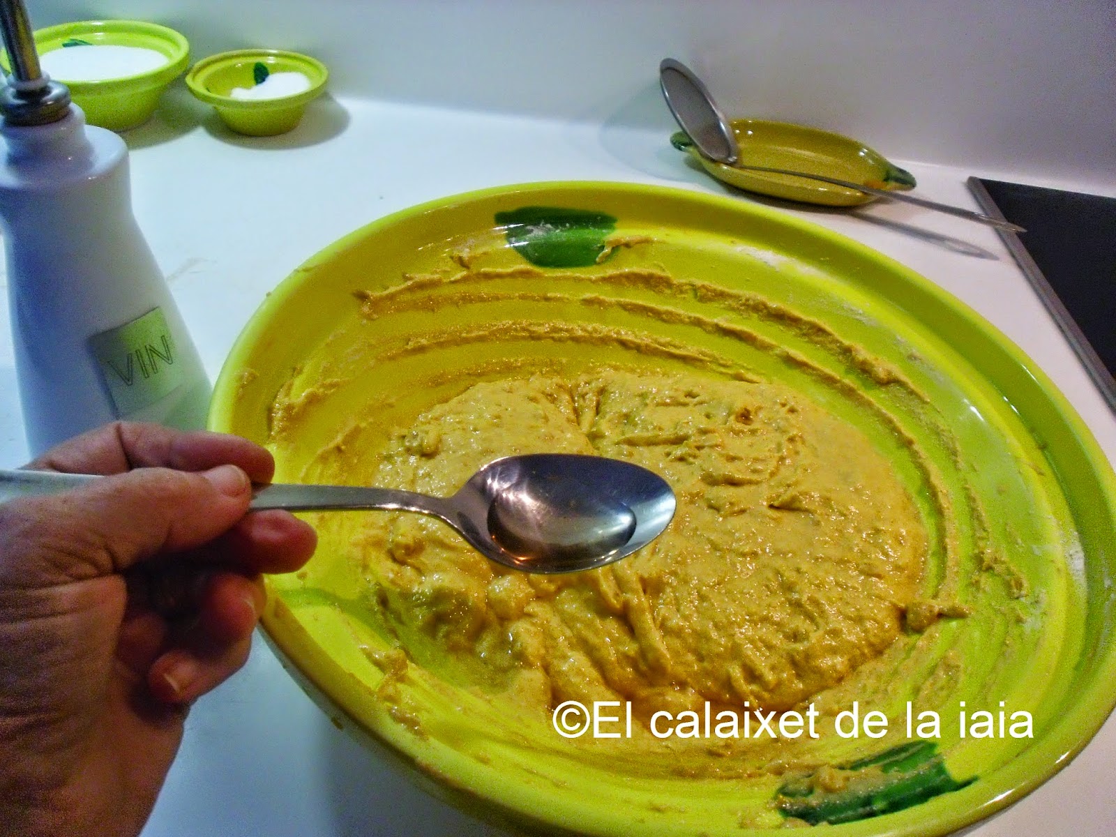 añadiremos una cucharada de vinagre blanco, con ésto evitaremos que se empapen demasiado de aceite, y la masa no cogerá sabor de vinagre… tranquil@s, los trucos de las iaias son infalibles, y no saben en absoluto a vinagre, mezclamos bien de nuevo y