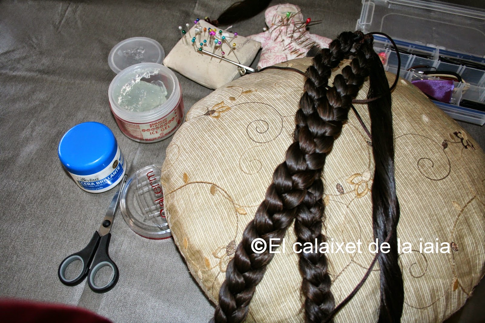 A la hora de colocar haremos con la ralla al medio o todo hacia atrás una coleta que quede a la altura de la mitad de las orejas colocaremos encima el «monyo» pasaremos el «canó» por el agujero derecho donde estaba la brocheta tanteando clavarlo entre la cabeza y la goma de la coleta, pasaremos al otro extremo y sacaremos por el agujero de la izquierda (lo podéis hacer al contrario, de izquierda a derecha) introduciremos la «espassa» y esconderemos el pelo natural de la coleta. Fijaremos con los ganchos necesarios (yo os recomiendo de los especiales largos para moño cosido), colocamos nuestra «pinta» y a disfrutar!!!