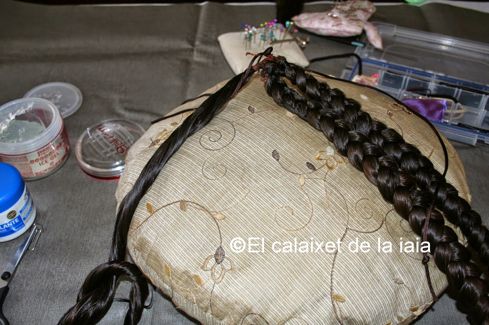 usaremos el palo de brocheta a modo de «canó» y haremos alrededor del mismo,retorciendo y enrollando poco a poco la malla primero, el ocho y el relleno, y vamos sujetando al cojín con alfileres. No os preocupéis si os queda muy abultado, luego podremos ir rectificando apretando y soltando cuando lo cosamos. Una vez hecho el ocho y el relleno, pondremos las trenzas alrededor del mismo primera una hacia un lado y luego la otra, hacia el lado contrario, cuidad que la trenza tiene dos caras, mirad la cara que queda mas bonita y es esa la que se ha de ver, hay que poner la trenza plana al cojín no de lado ni de perfil, de manera que quede plana y aplastadita. Una vez el moño hecho, con hilo del mismo color del pelo y una aguja que si es curvada, mejor, pasaremos unas puntadas de parte a parte, desclavaremos los alfileres y volcaremos el moño en otro cojín dejándolo del revés, ahora coseremos para que el moño quede bien sujeto sin problemas porque quedará la costura del revés aprovecharemos para darle la forma ovalada, y de pataqueta y ajustaremos el ocho, los agujeritos del mismo han de quedar muy chiquitines para que al meter la espassa i el canó parezca un moño hecho en el momento, y natural.
